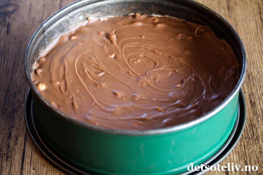 Fordel sjokoladekremen over mandelbunnen i formen. Sett formen i kjøleskapet i noen timer eller over natten (eller i fryseren, så går det fortere) til sjokoladekremen har stivnet.