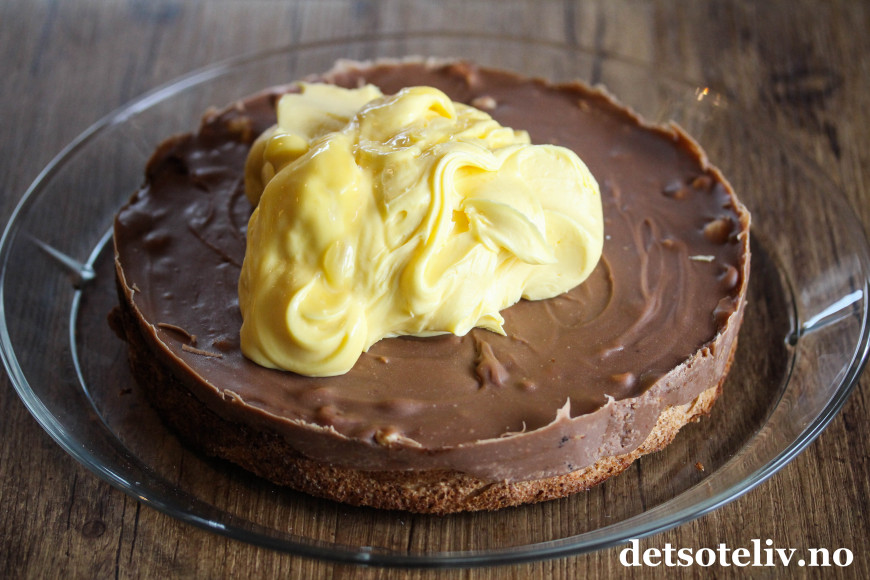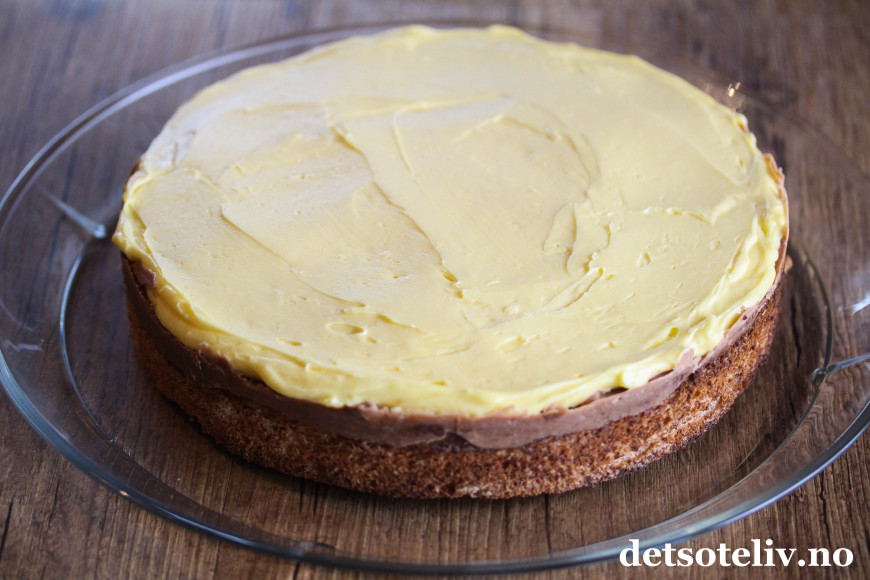 Fordel den tykke, piskede, gule kremen over kaken. Sett kaken tilbake i kjøleskapet i noen timer slik at den gule kremen blir helt fast i konsistensen.