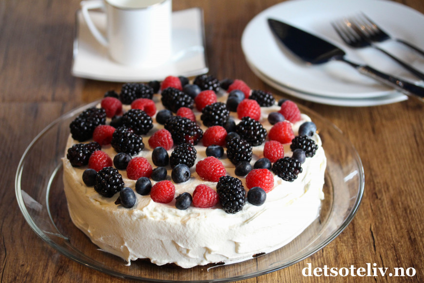 ♥ Kaken bør serveres samme dag som den pyntes med krem og bær, slik at dette er helt ferskt.
