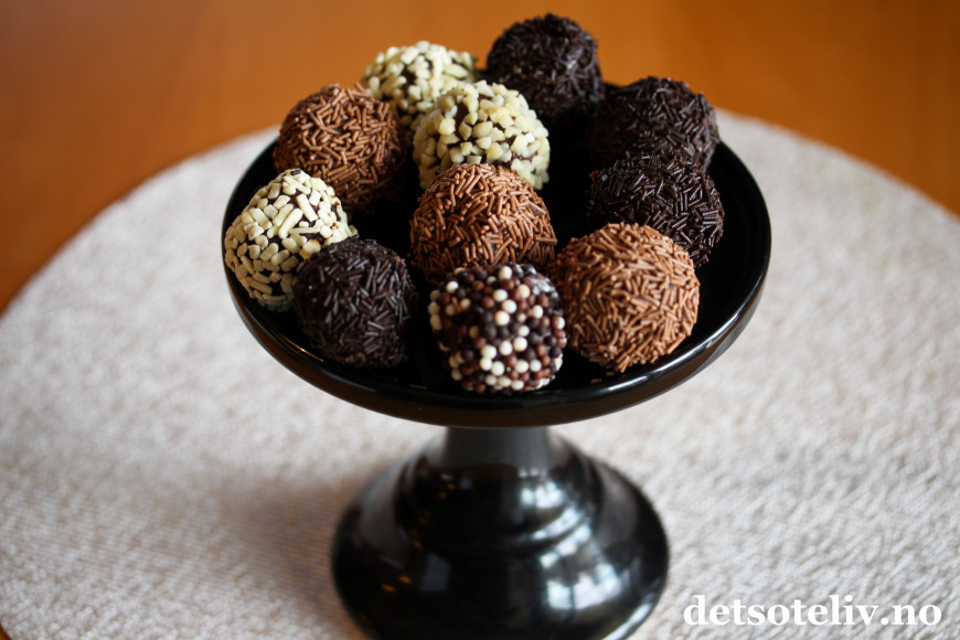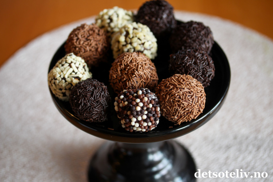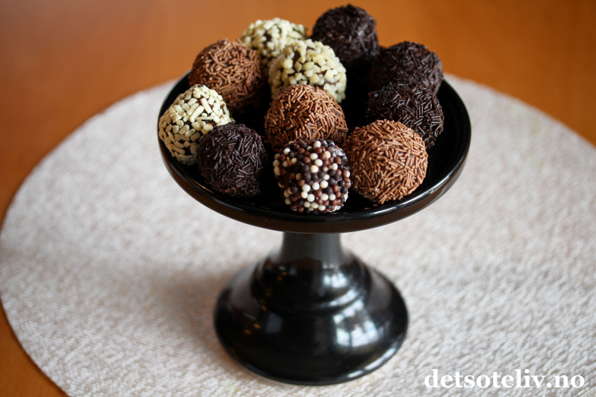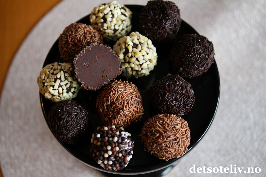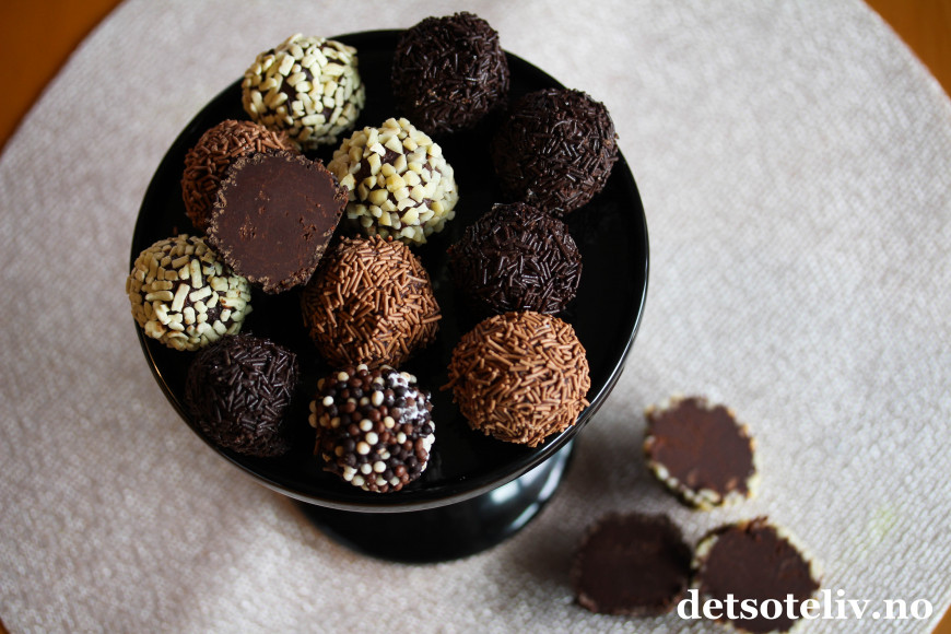 Trill kuler av sjokolademassen med hendene (dette er litt klissete, så skyll hendene ofte). Rull kulene i forskjellig type strøssel. Sett kulene i kjøleskapet til de har stivnet.
