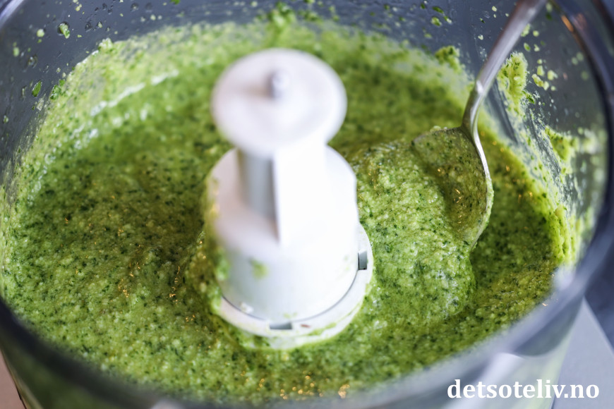 Start gjerne med å lage klar pestoen (det går fint å gjøre dette flere dager før servering).