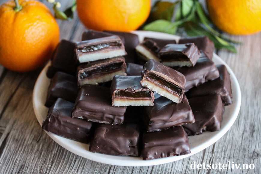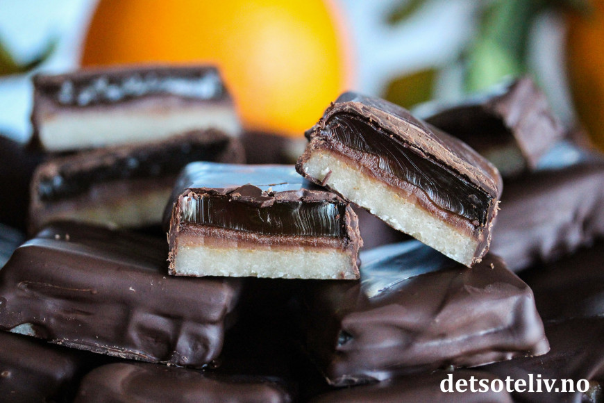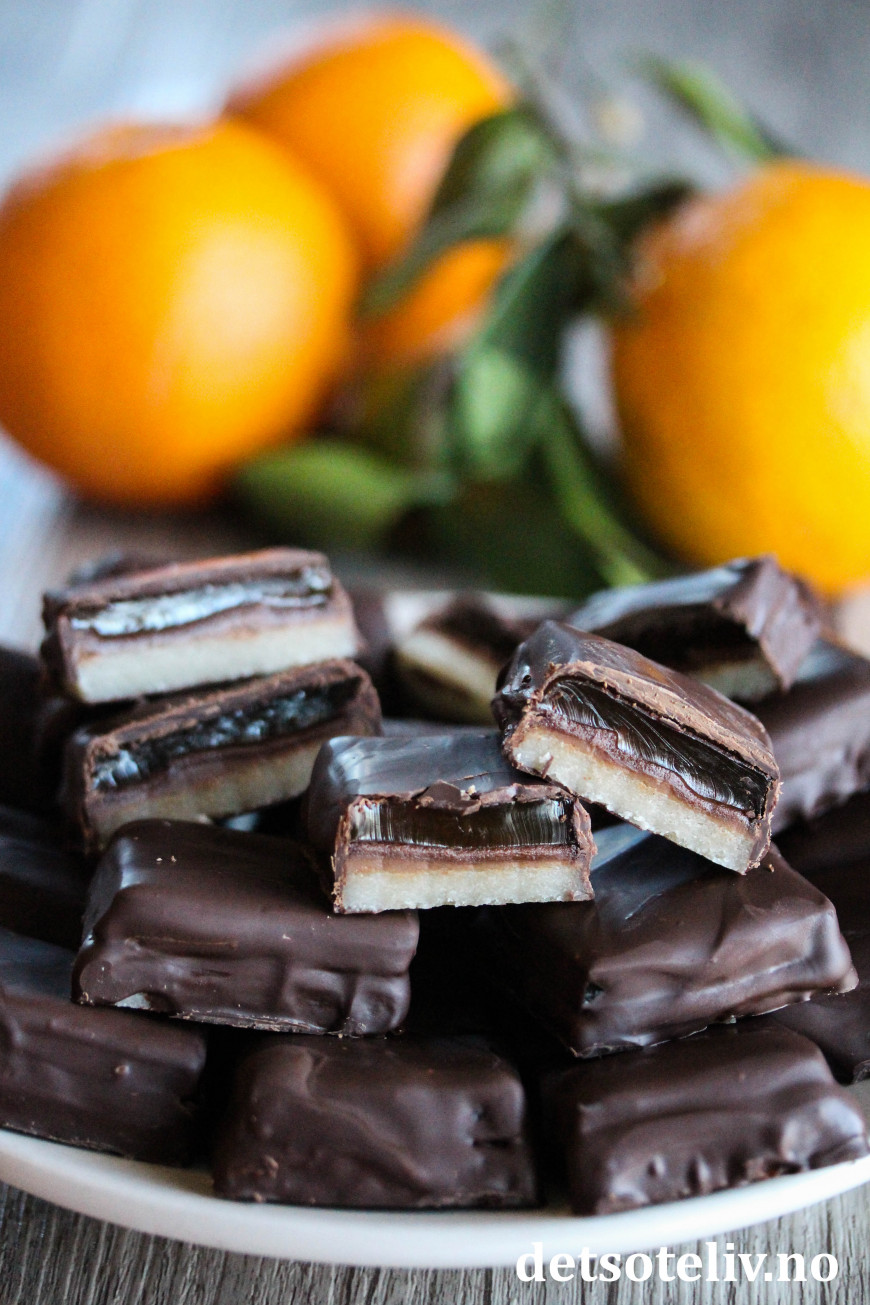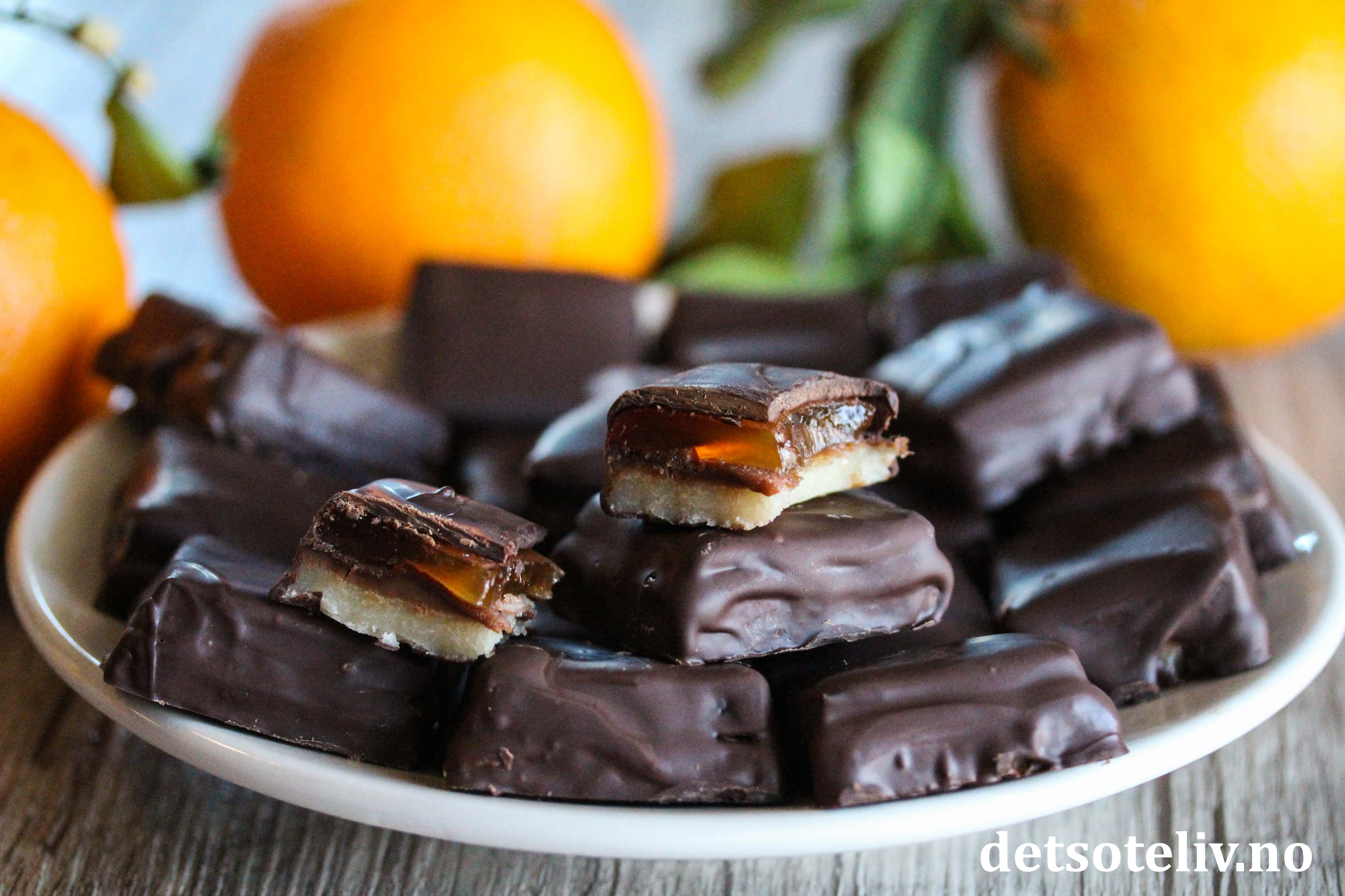 Her har jeg laget en påske edition av konfekten der bringebærgelé er byttet ut med appelsingelé.