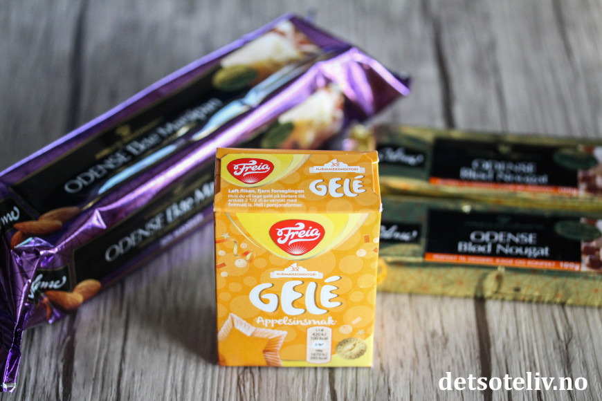 ♥ Når du bruker 2 pk gelé til 5 dl vann, bruker du halvparten av vannmengden enn det som står på pakken. Det gjør at geléen blir stivere slik at konfekten holder fasongen bedre.