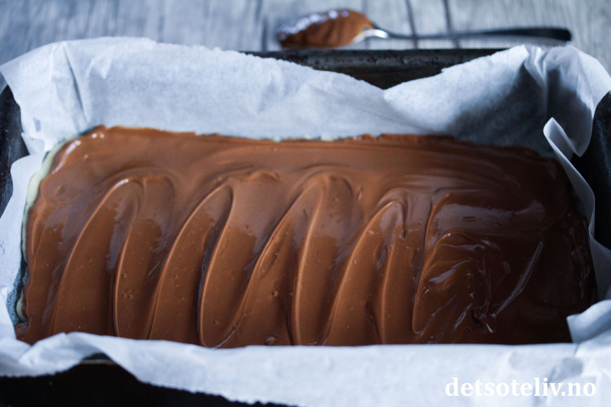Når sjokoladen er flytende, henter du langpannen ut av kjøleskapet. Ta tak i bakepapiret og løft det hele ut av langpannen. Bruk så en skarp kniv og skjær opp i passe store firkanter.