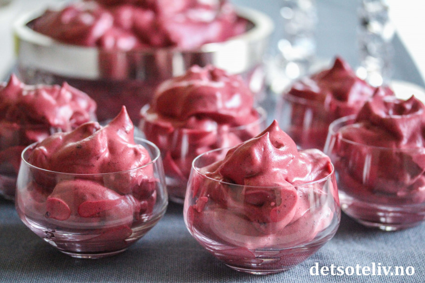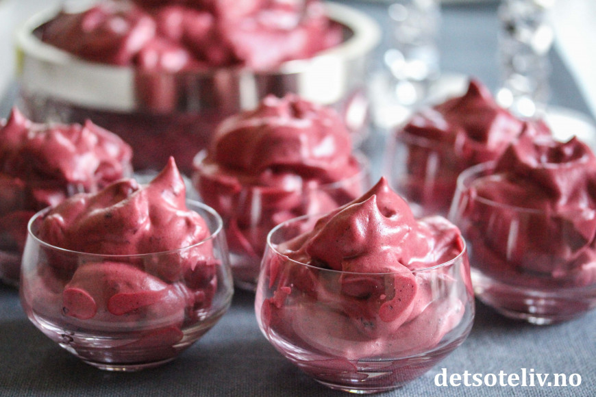 Det går imidlertid like fint å lage trollkrem med andre typer bær. Her har jeg laget denne herlige, luftige kremen med nyplukkede blåbær. Noen kaller kremen da for "Vettekrem" i stedet for Trollkrem.