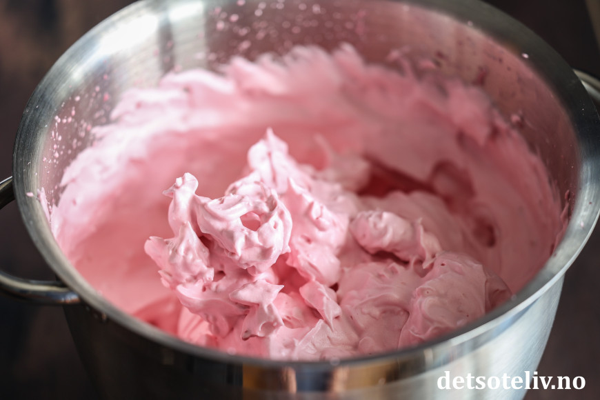 Øk hastigheten etter hvert og pisk til slutt kraftig. Det tar ca. 8-10 minutter med kraftig pisking i kjøkkenmaskinen før trollkremen er skikkelig tykk, luftig og stiv.
