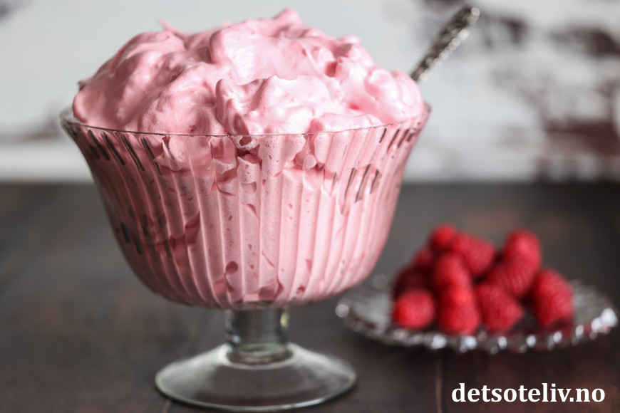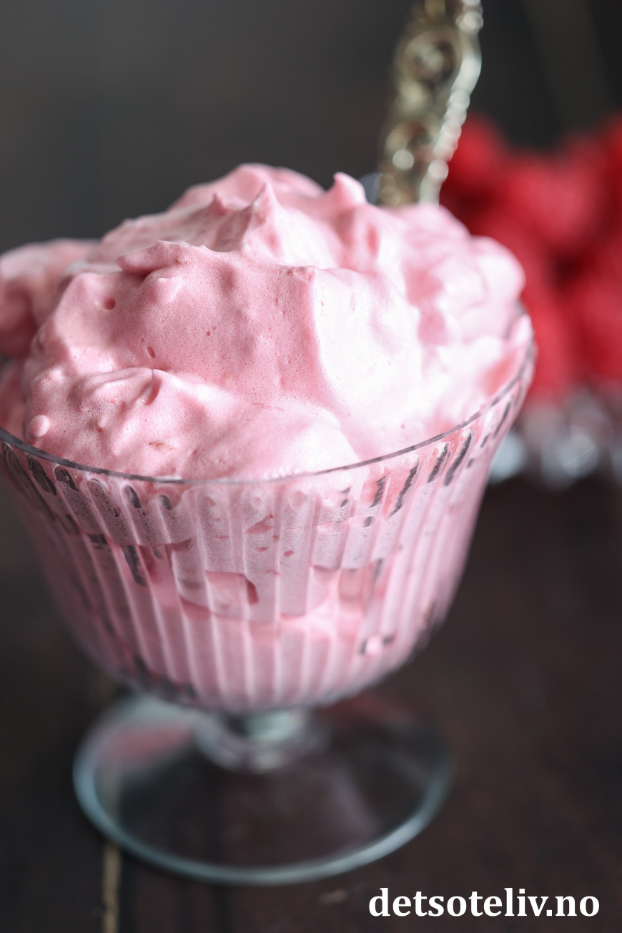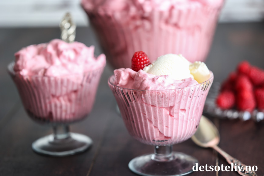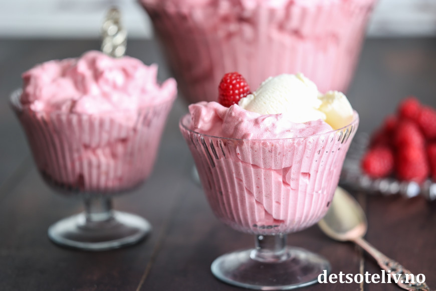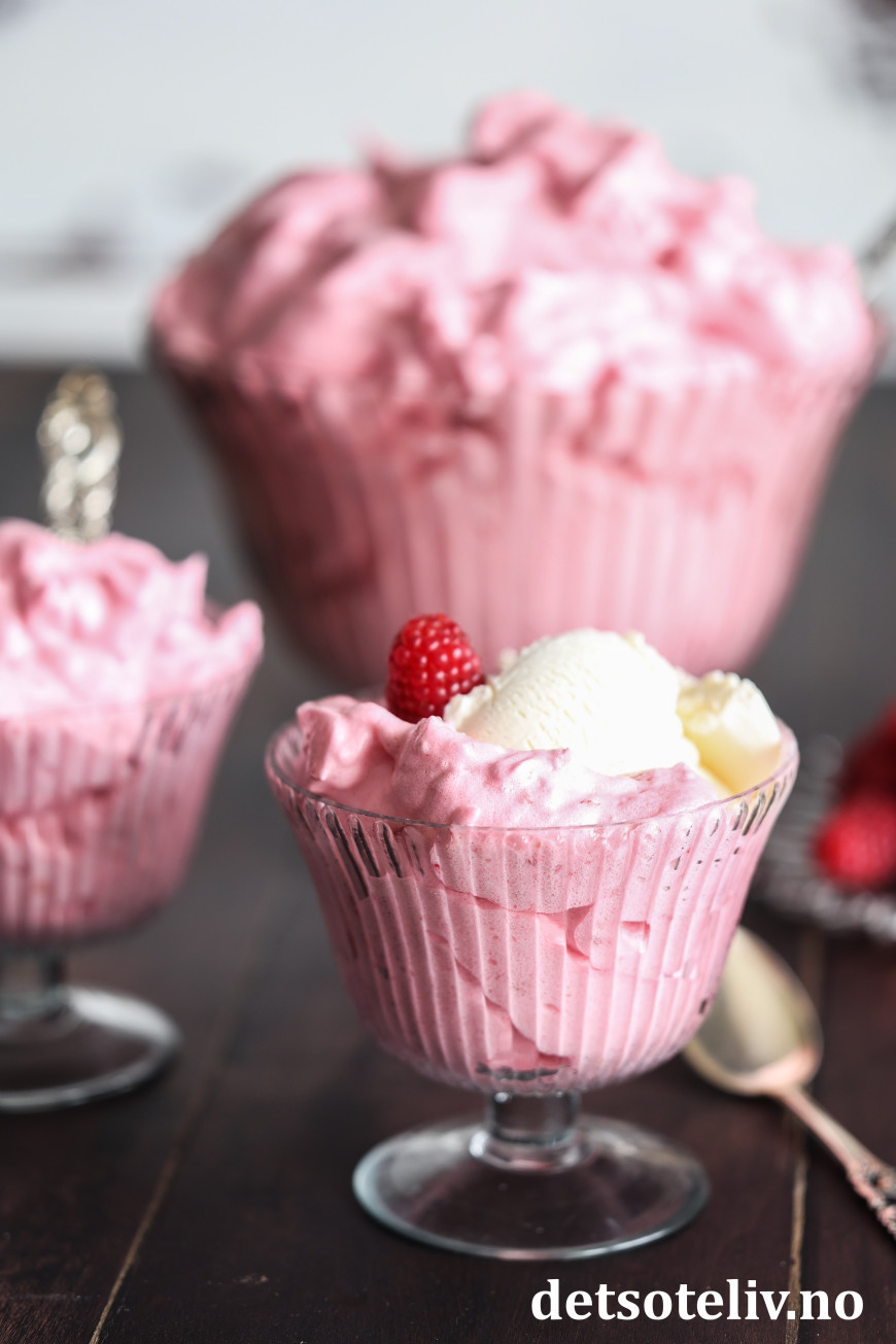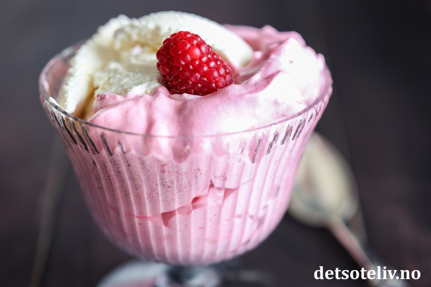 Jeg brukte vaniljeis denne gangen, og det ble superdeilig når vaniljeisen etter hvert smeltet litt sammen med bringebærskummet... 😋