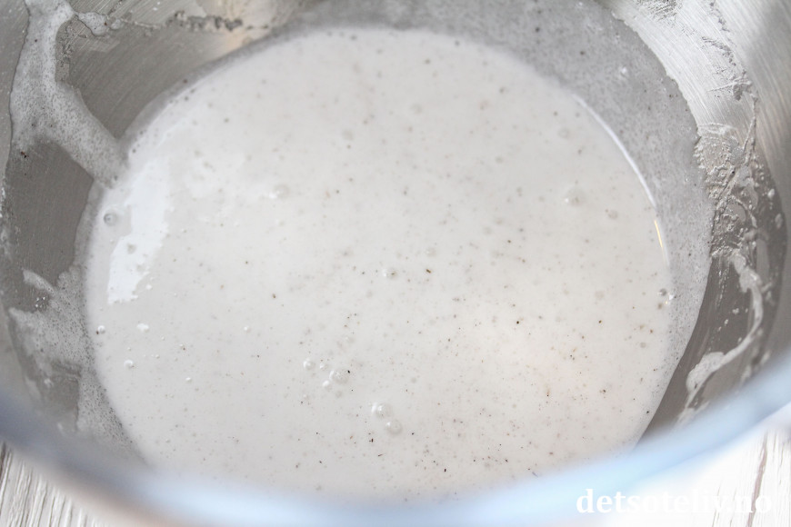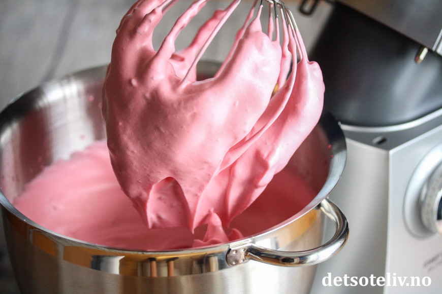Øk hastigheten etter hvert og pisk til slutt kraftig. Det tar ca. 8-10 minutter med kraftig pisking i kjøkkenmaskinen før trollkremen er skikkelig tykk, luftig og stiv.
