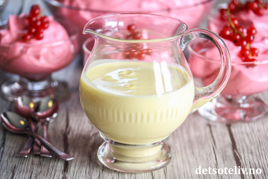 Du kan bruke hjemmelaget vaniljesaus eller ferdigkjøpt.