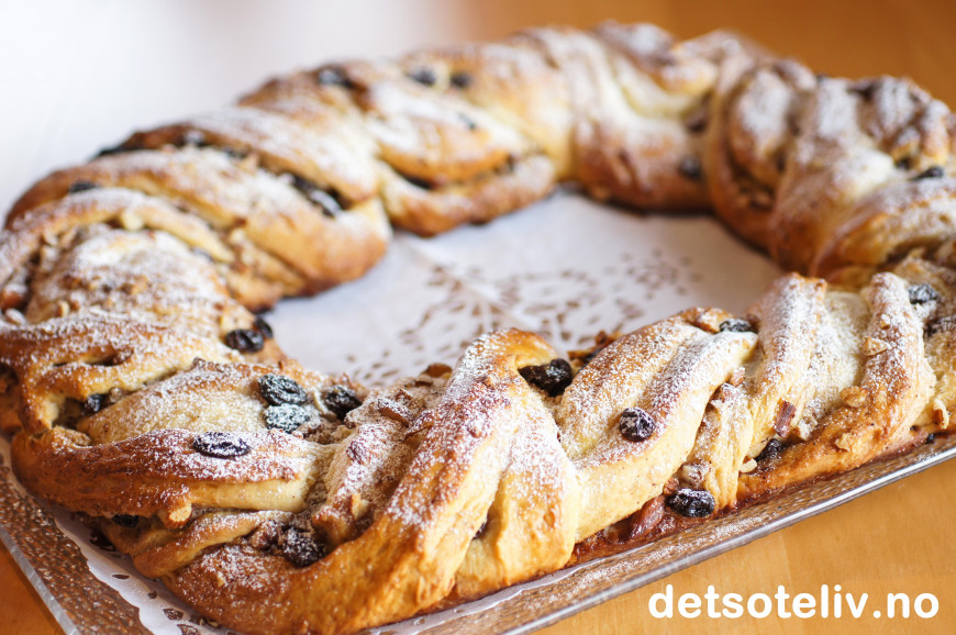 Stek kransen nederst i ovnen ved 200°C i ca 30 minutter, til kransen er gylden og gjennomstekt. Avkjøl helt.