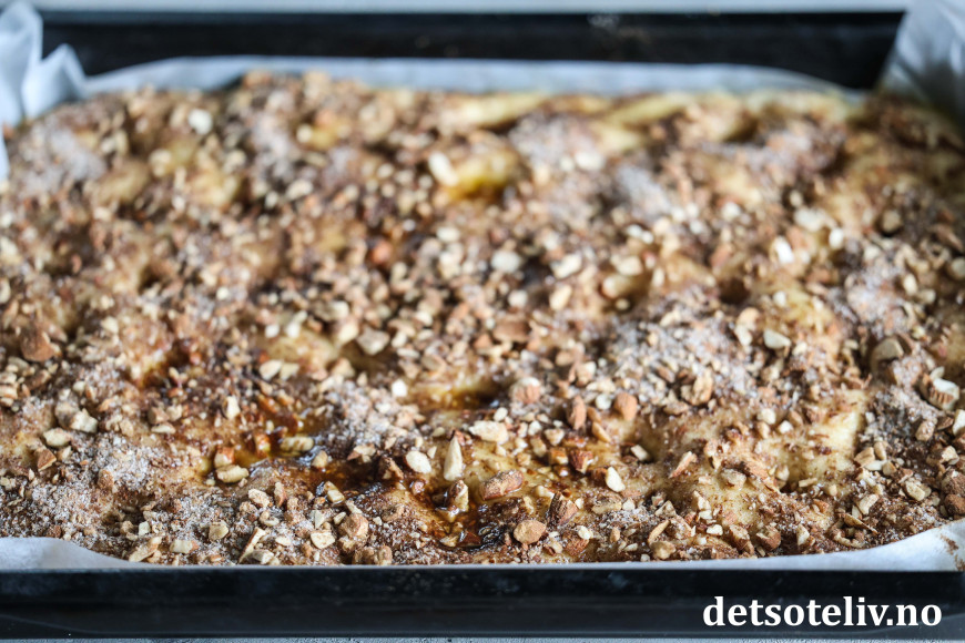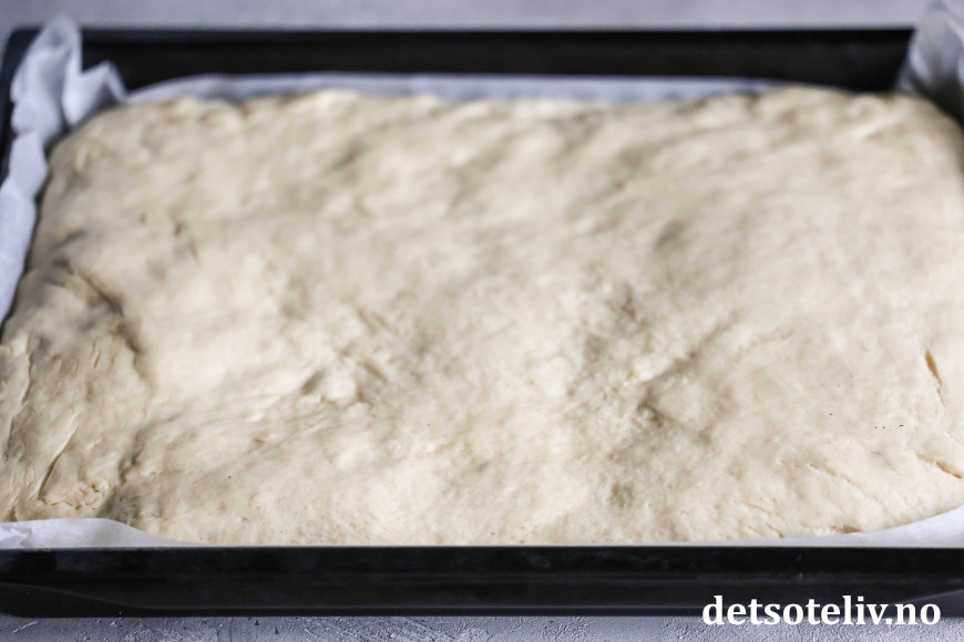 Finn frem en stor langpanne (ca 30 x 40 cm) og kle den med bakepapir. Ha gjærdeigen i pannen og klem den godt utover slik at den dekker hele langpannen.