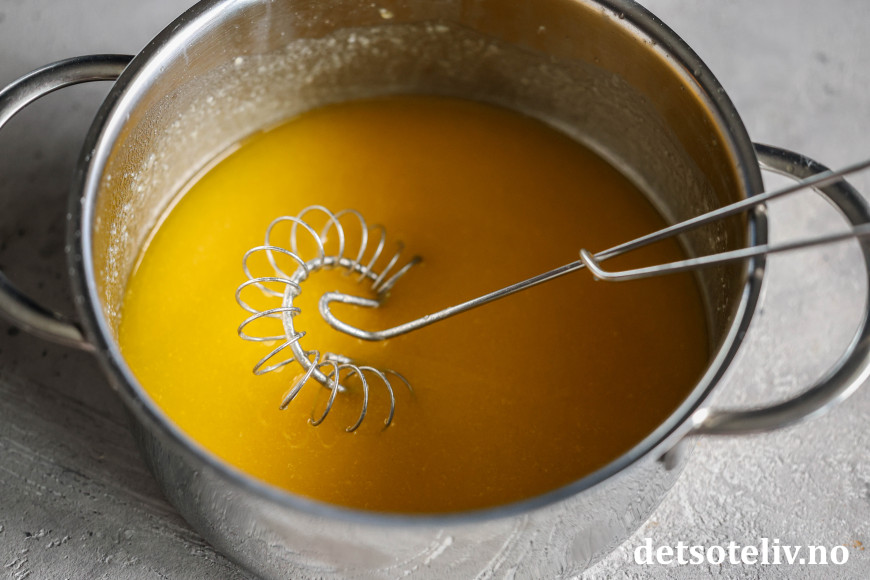 Lag imens smørtoppingen ved å smelte smøret i en kjele. Visp inn sukkeret og hvetemelet.