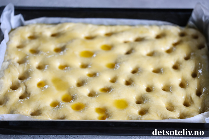 Finn frem en stor langpanne (ca 30 x 40 cm) og kle den med bakepapir. Ha gjærdeigen i pannen og klem den godt utover slik at den dekker hele langpannen. Dekk til med et kjøkkenhåndkle og la deigen heve i langpannen i 45 minutter.