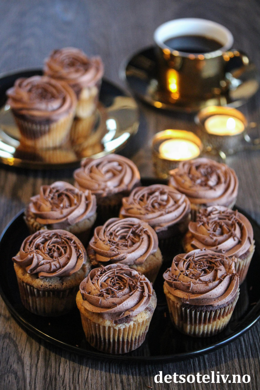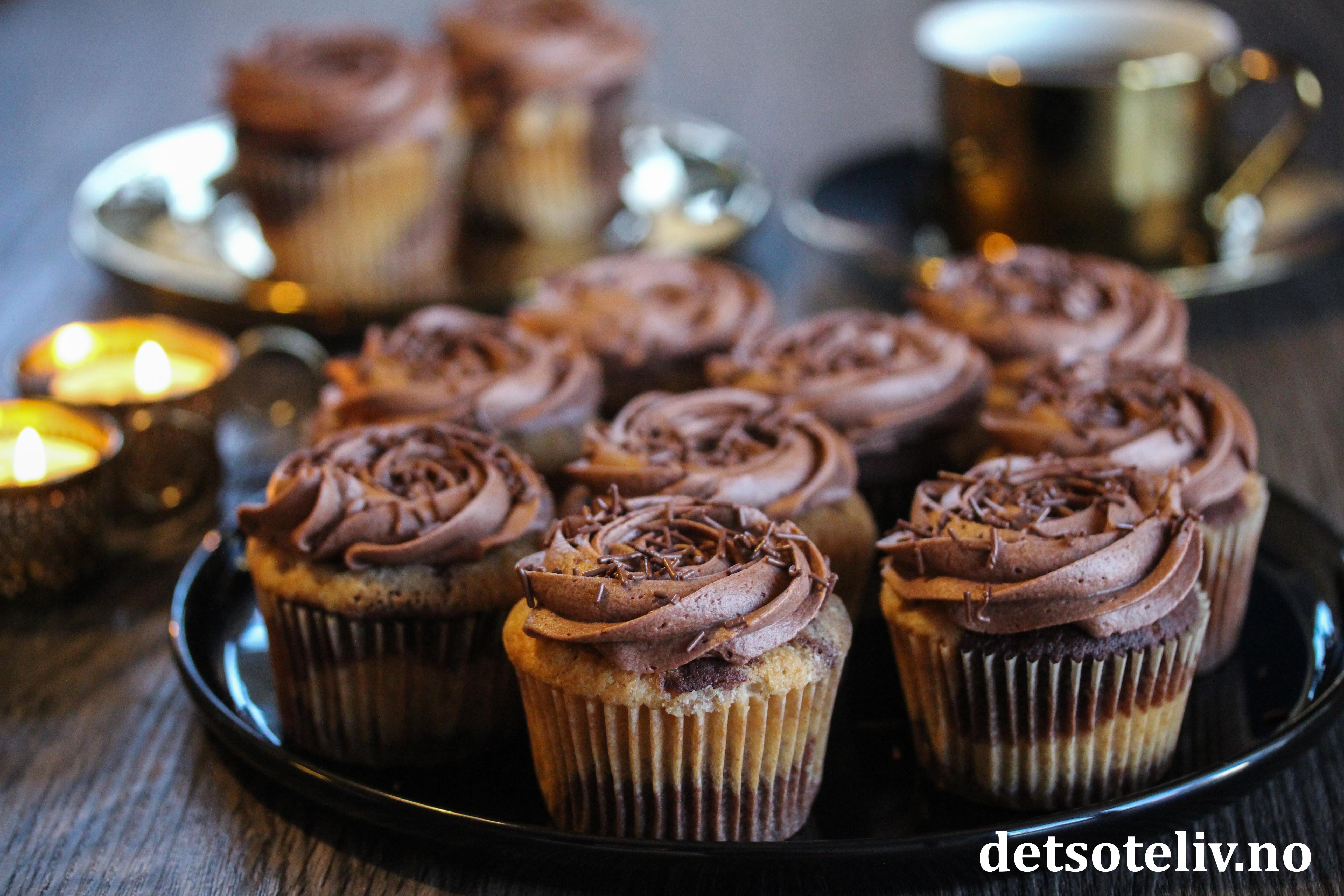 Muffinsene er toppet med deilig sjokoladekrem og er kjempegode!