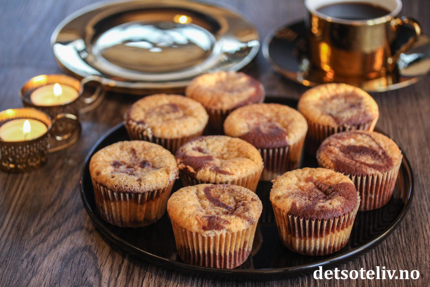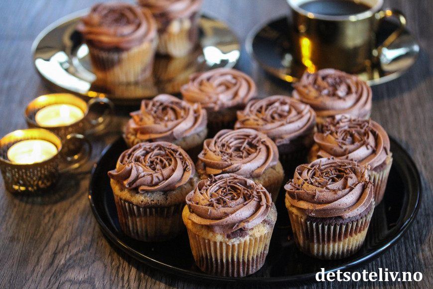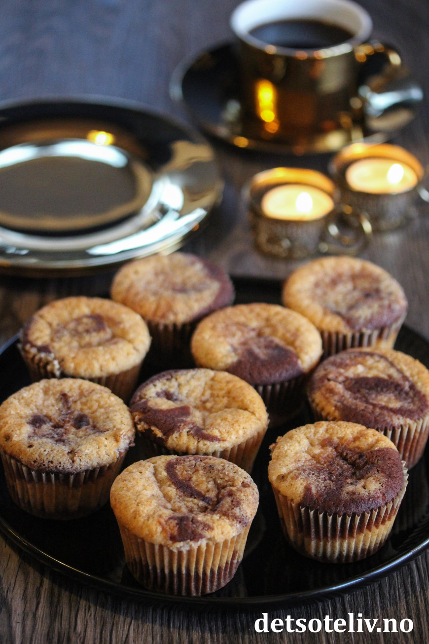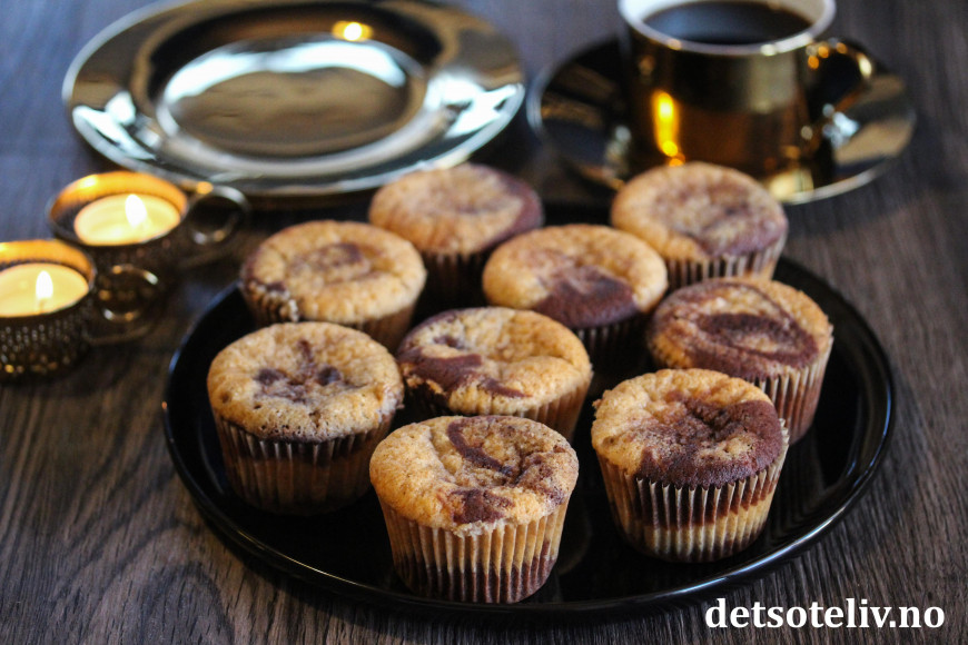 Sett papirformer i muffinsbrett. Fyll formene med mørk og lys deig om hverandre slik at muffinsene blir marmorerte, til formene er omtrent 2/3 fulle.
