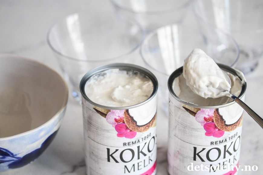 Alternativt kan du bruke 2 bokser med kokosmelk som fås kjøpt i de fleste norske matbutikkene, men da er det viktig at du bruker kokosmelk med fullt fettinnhold. La kokosmelkboksene stå i kjøleskapet over natten.