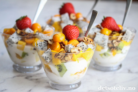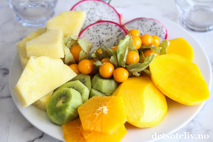 Topp med tropisk frukt - og gjerne jordbær for fargens skyld.