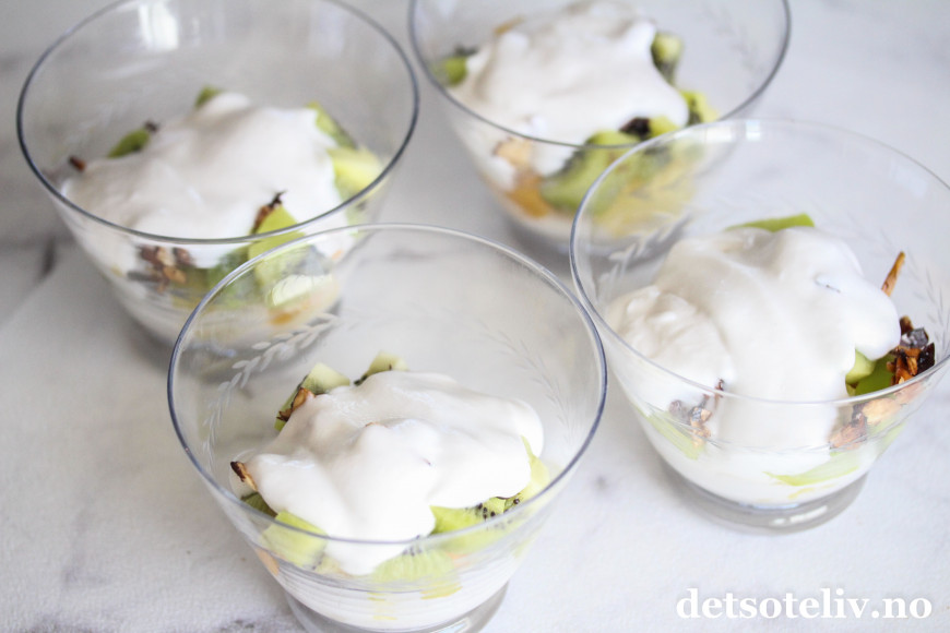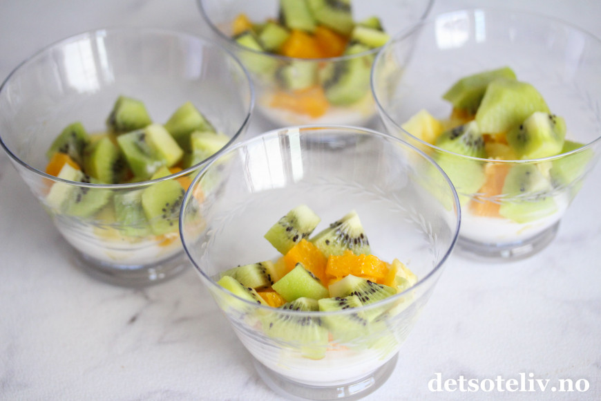 Legg litt kokoskrem og deretter frukt nederst i dessertskålene.