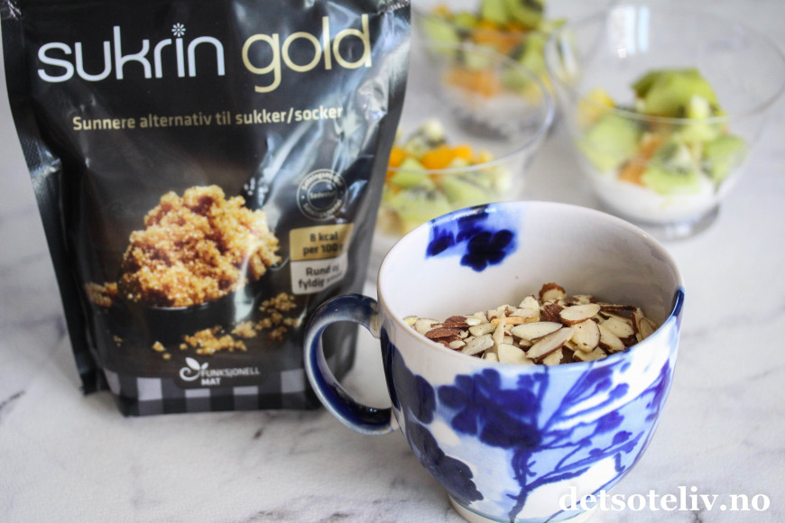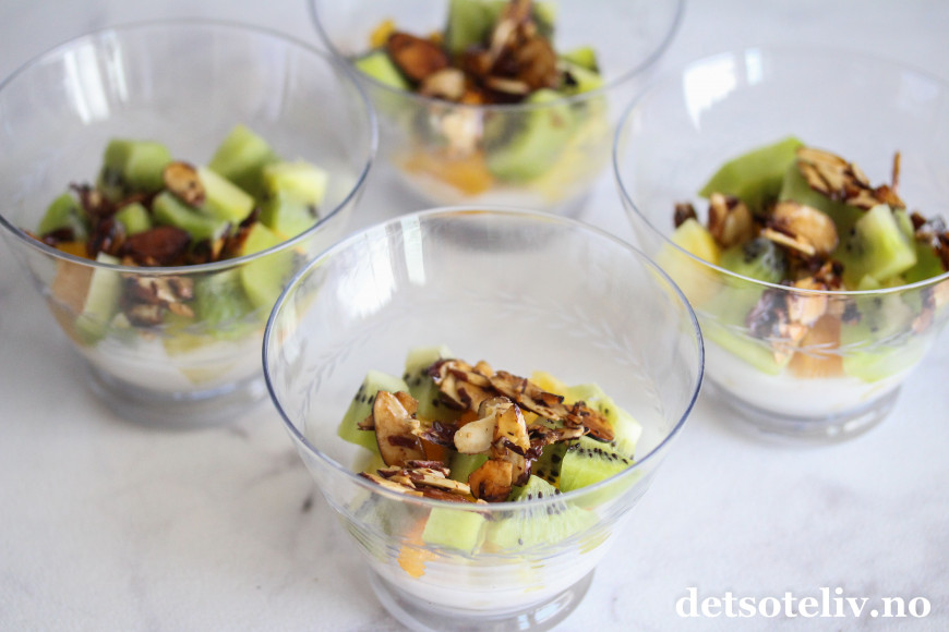 Fruktene serverer jeg med kokoskrem, og karamelliserte mandler for å gi desserten litt "crunch".
