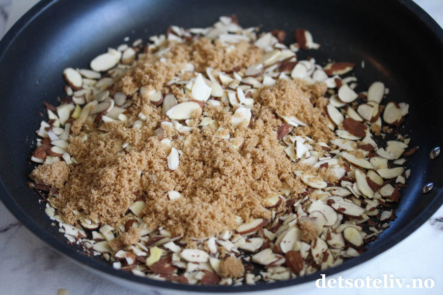 Ha mandelflak og brunt sukker (eller sukrin gold som jeg bruker her) i en stekepanne.