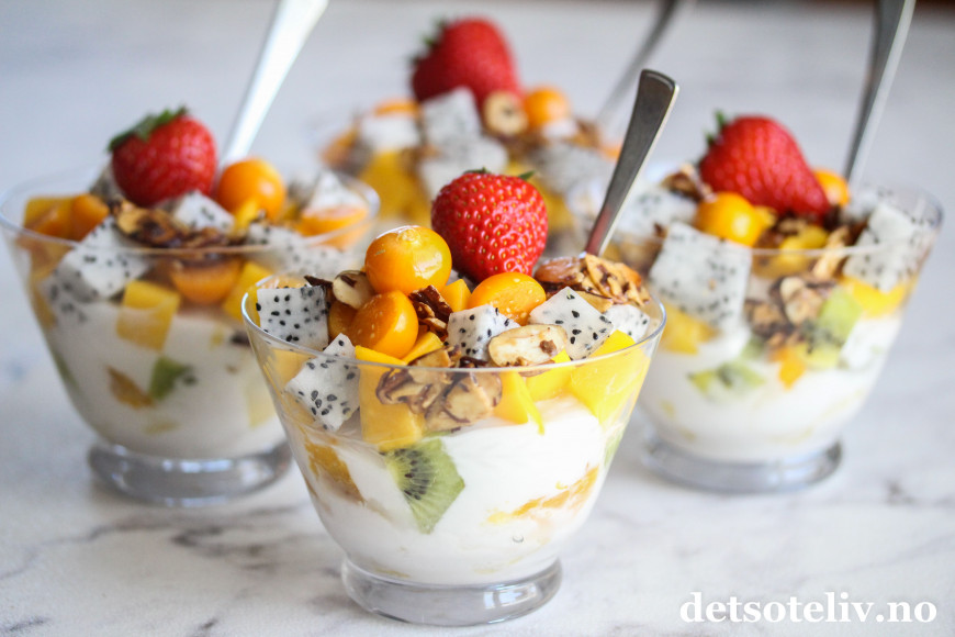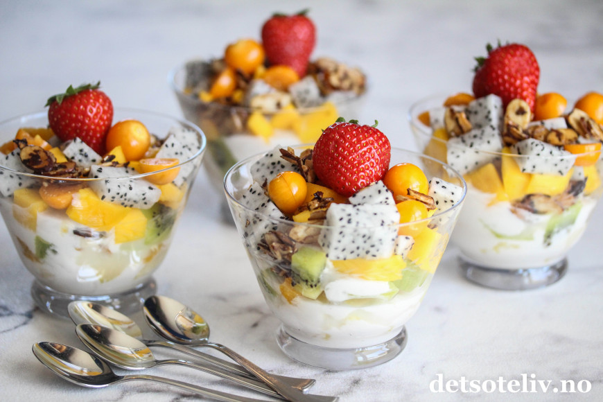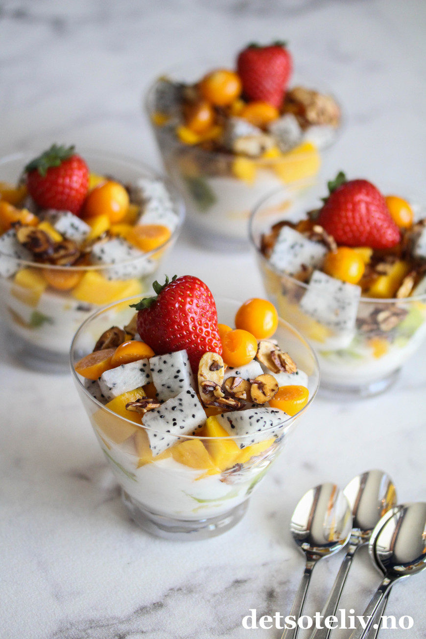 ♥ Bruk et variert utvalg tropiske frukter for å få en spennende dessert! Det jeg har angitt er såklart bare et forslag, så bruk det du får tak i og liker. Velassorterte matvarebutikker har mye å velge mellom.