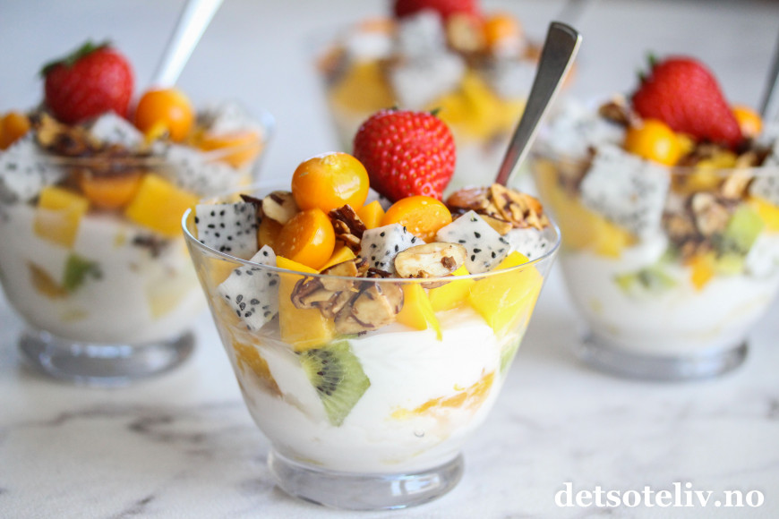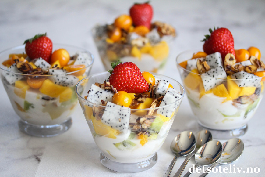 Lette, fruktige desserter er nydelige i sommervarmen. Her har jeg laget en deilig dessert med tropiske frukter i ulike varianter.