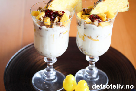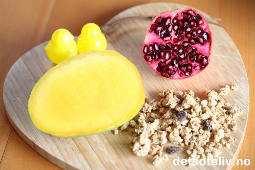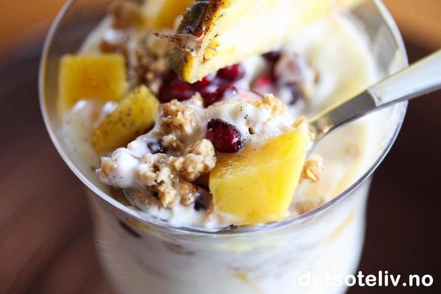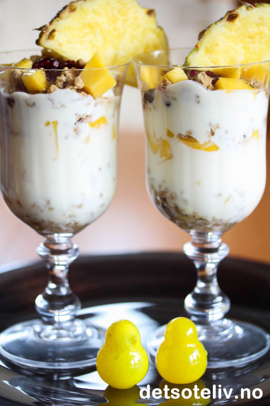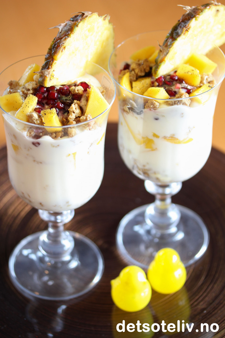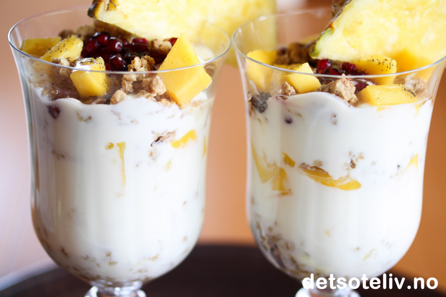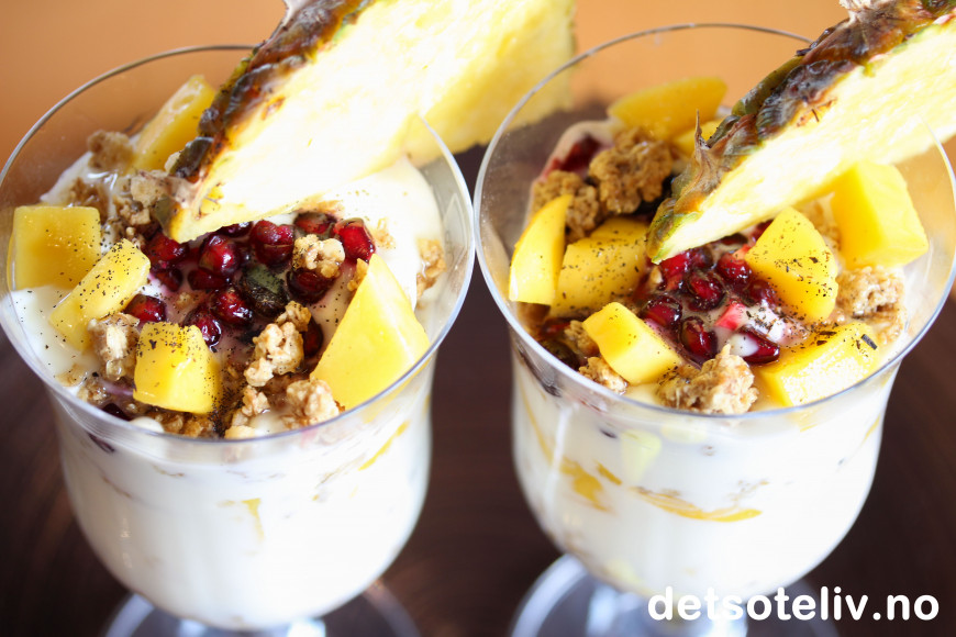 ♥ Bruk den tropiske frukten du liker best. Bruker du mango som jeg har gjort her, er det viktig for smaken at mangofrukten er skikkelig søt og god. Jeg brukte fersk ananas kun som pynt, men ananasbiter er også godt blandet sammen med yoghurten. Papaya er også godt. Granateple gir nydelig smak og er lekkert å se på, men er litt syrlig, så jeg synes det holder med noe på toppen.