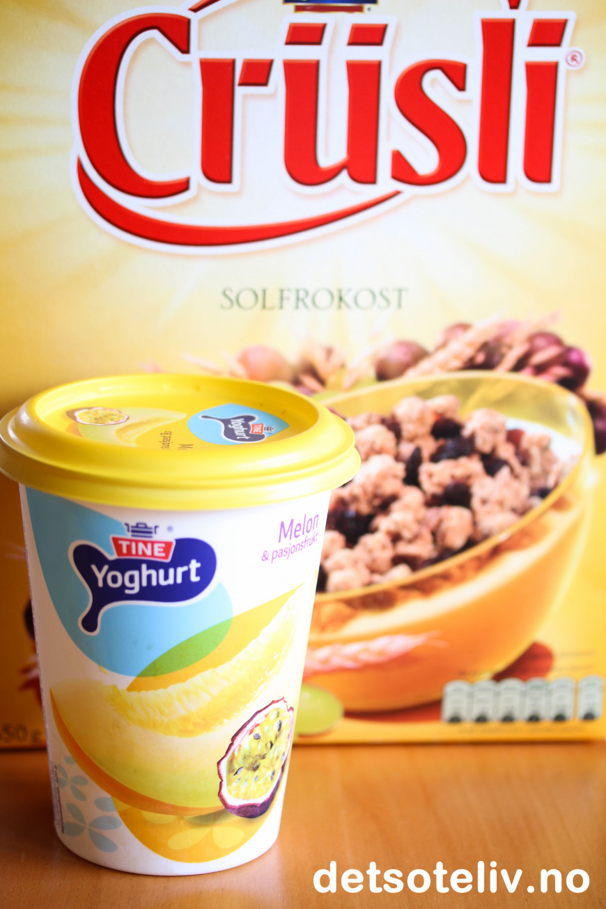 ♥ Jeg har brukt yoghurt med smak av melon og pasjonsfrukt, som smaker utrolig nydelig sammen med tropisk frukt.