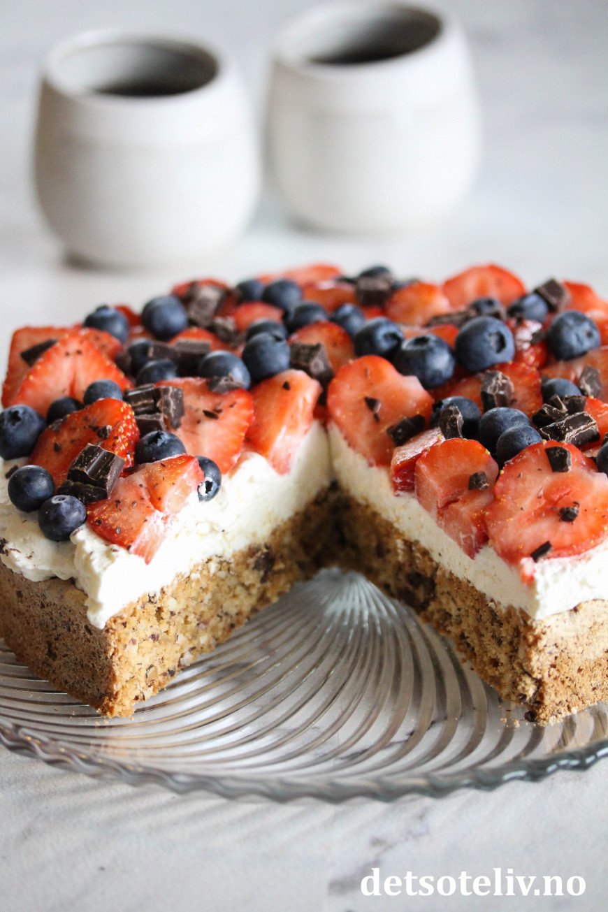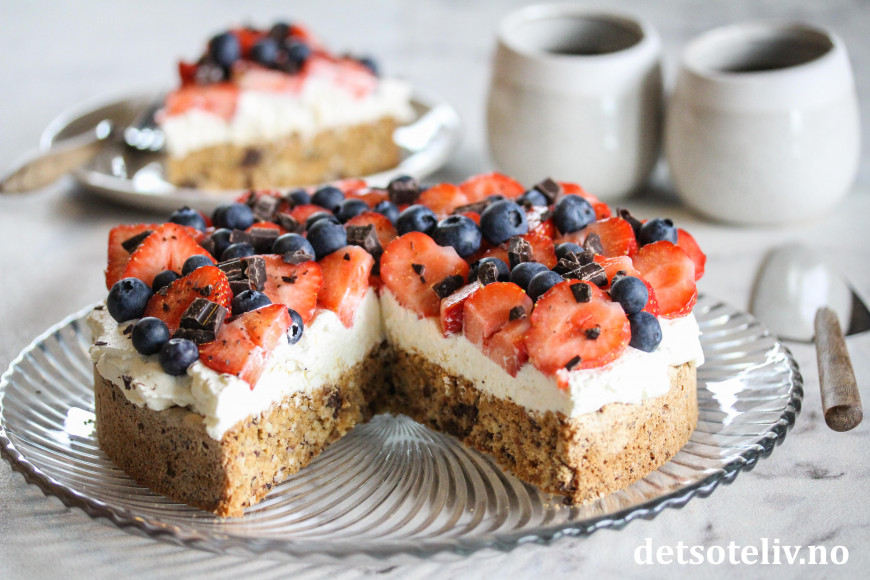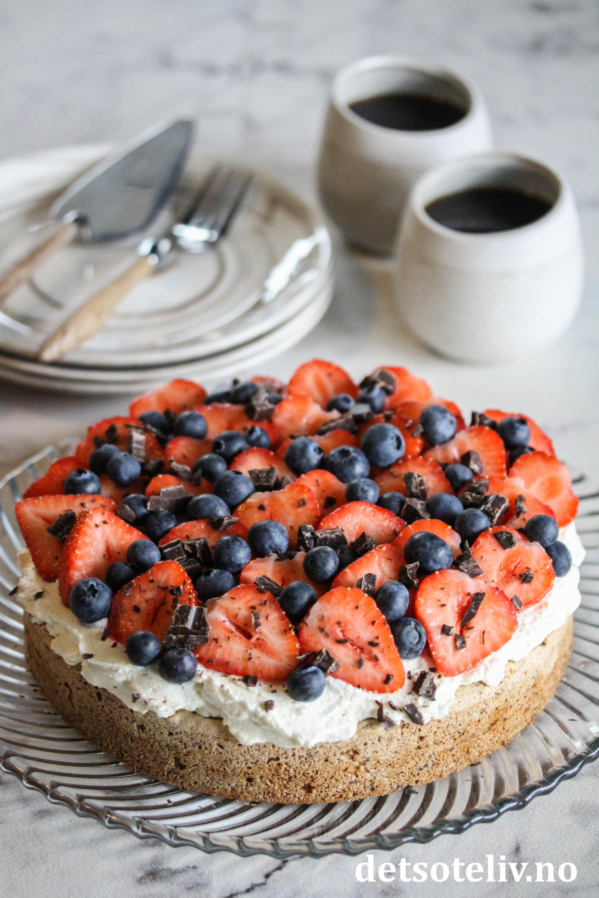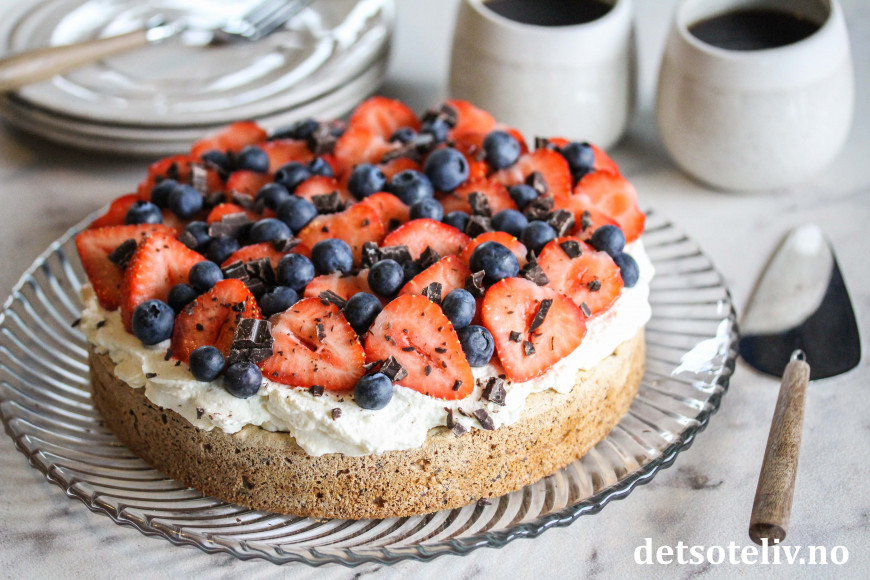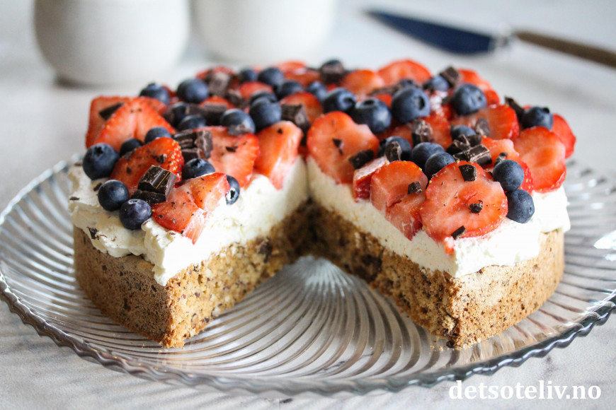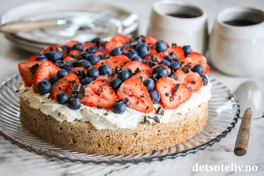 ♥ Kakebunnen kan fint lages et par dager i forveien, og den er også gjerne fryses. Kaken bør pyntes med fløtekrem og friske bær på serveringsdagen.