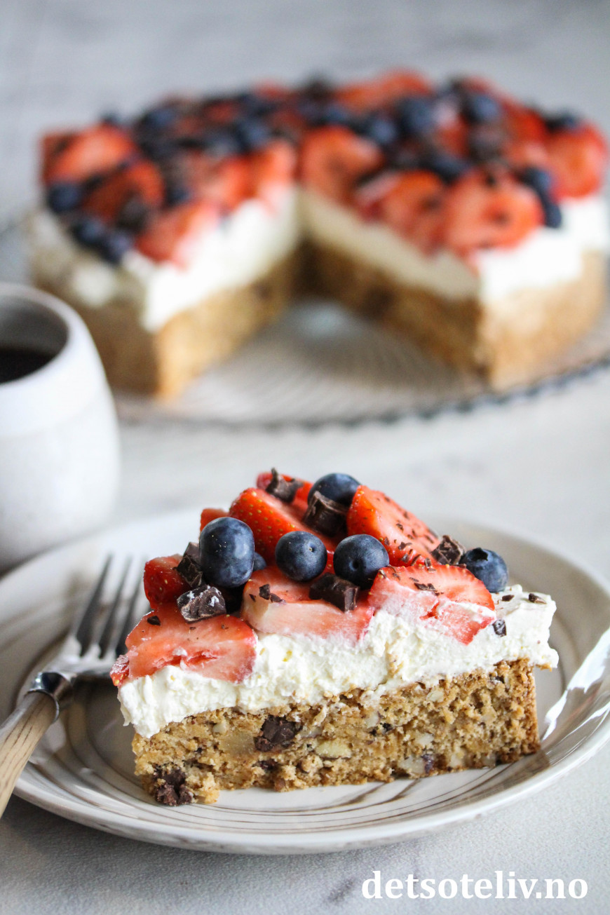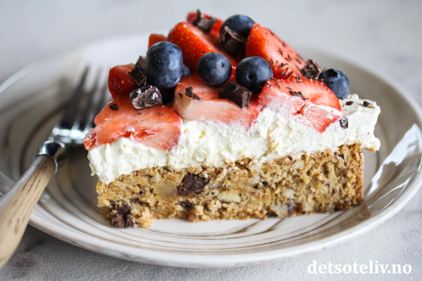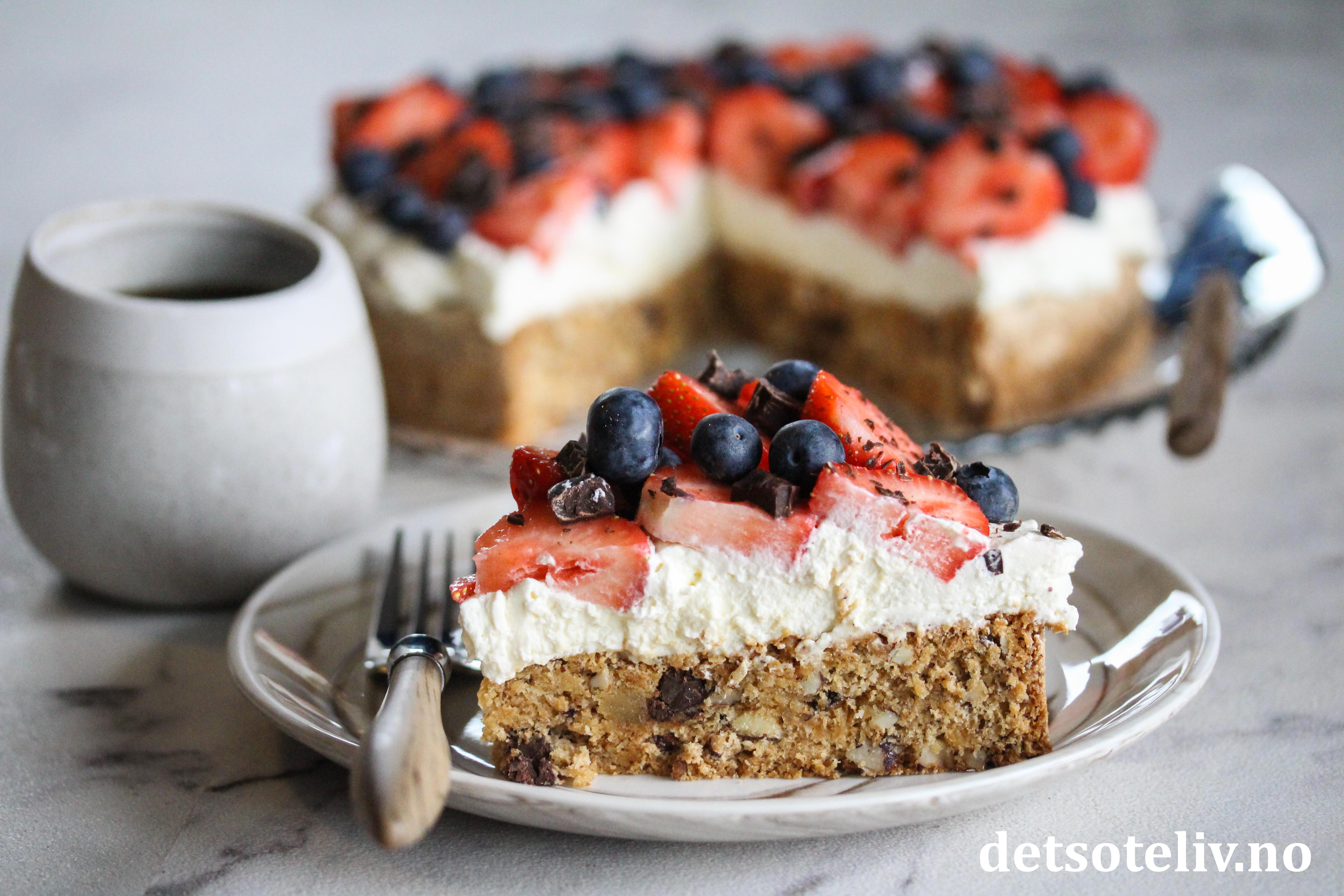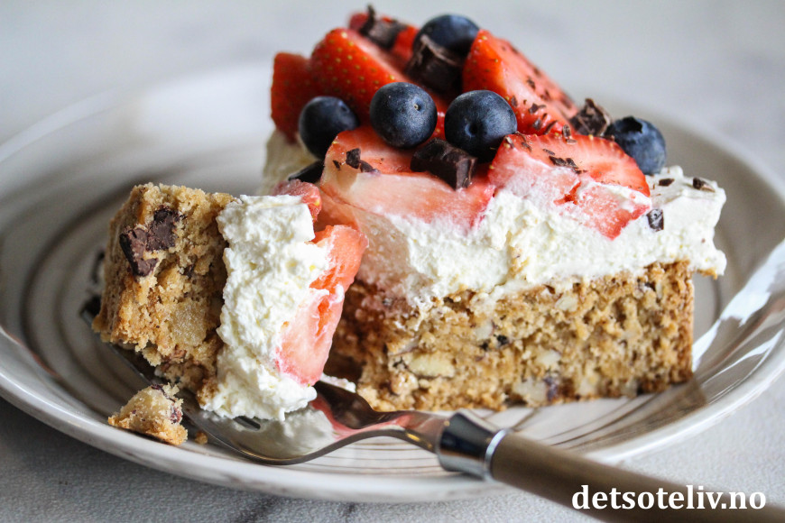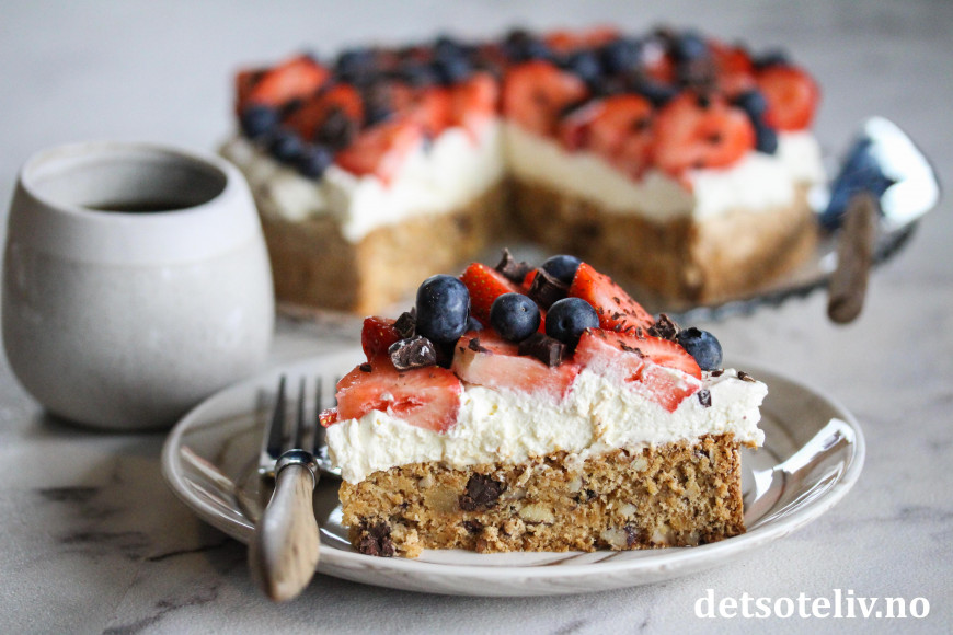 ♥ Kakebunnen kan fint lages et par dager i forveien, og den er også gjerne fryses. Kaken bør pyntes med fløtekrem og friske bær på serveringsdagen.