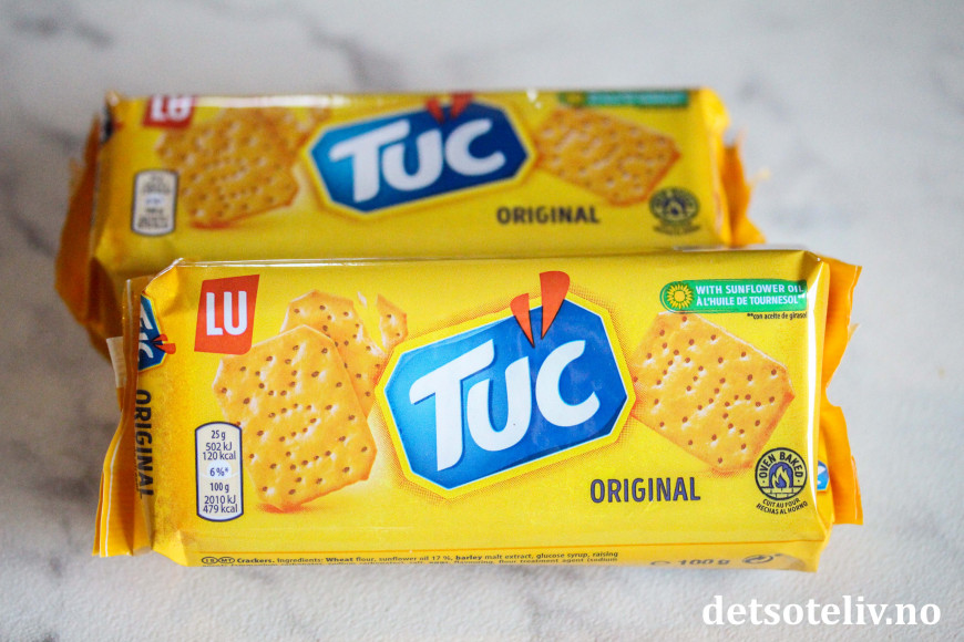 ♥ TUC-kjeks fås kjøpt i mange, norske matbutikker. Bruk den vanlige, salte varianten. Det går som sagt helt fint å bruke Ritzkjeks i stedet.