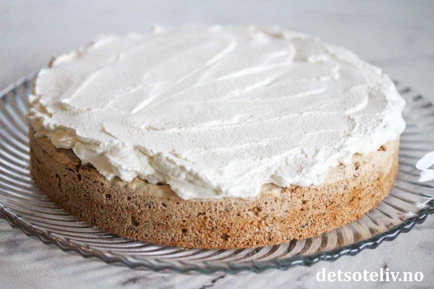 Ha kakedeigen i en rund form (24 cm i diameter) med bakepapir i bunnen. Jevn til overflaten. Stek kaken midt i ovnen ved 160°C i ca. 35-40 minutter. La den så avkjøles i formen til den er helt kald (se tips).