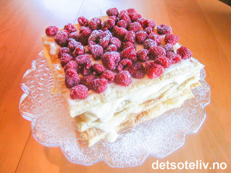Rør sammen glasuren og stryk over den øverste butterdeigsbunnen. Sett den på toppen av kaken og pynt med friske bringebær og et melisdryss.