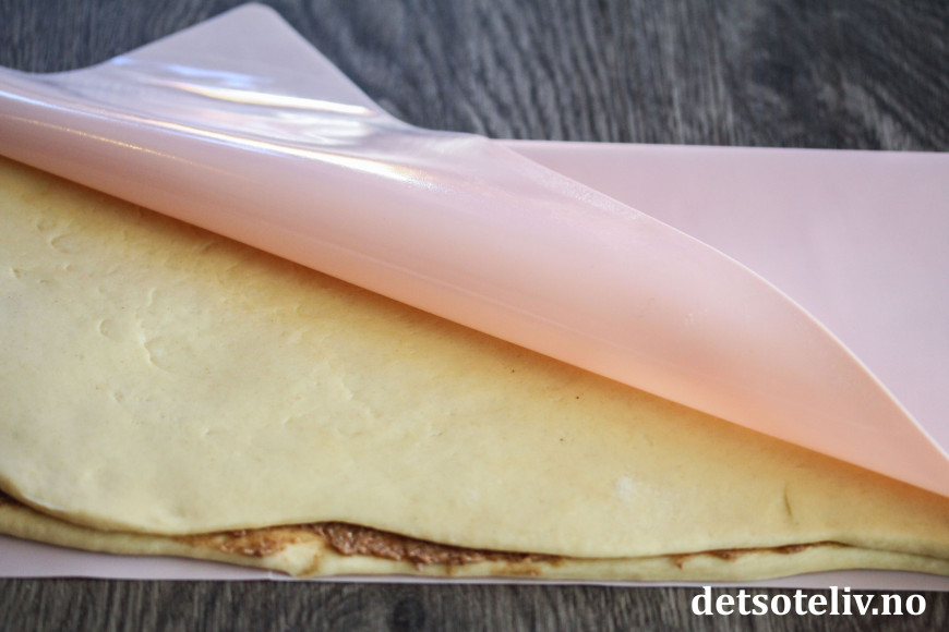 Brett leiven dobbelt fra langsiden. Kjevle eller klapp leiven lett så den blir litt tynnere og jevn i kantene.