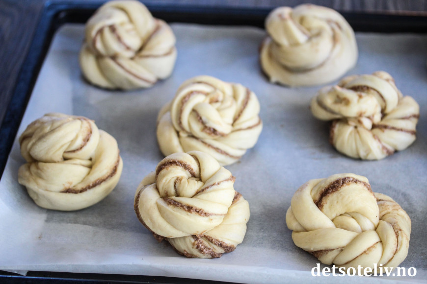 Legg knutene på bakepapirdekkede stekeplater. Etterhev knutene i ca. 30 minutter.