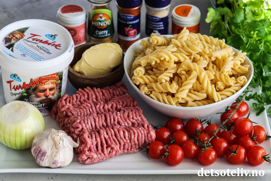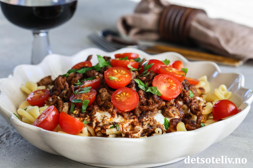 Mens hjemmelaget Manti krever en nokså omstendelig prosess, er Tyrkisk pasta derimot veldig rask å lage! Tyrkisk pasta består av vanlig, kokt pasta som først toppes med yoghurtsaus med masse ferskpresset hvitløk, deretter krydret kjøttdeig, og så en smørsaus smaksatt med paprikapulver. Pastaretten toppes med friske tomater og bladpersille. Resultatet blir en original og skikkelig digg pastarett!😋