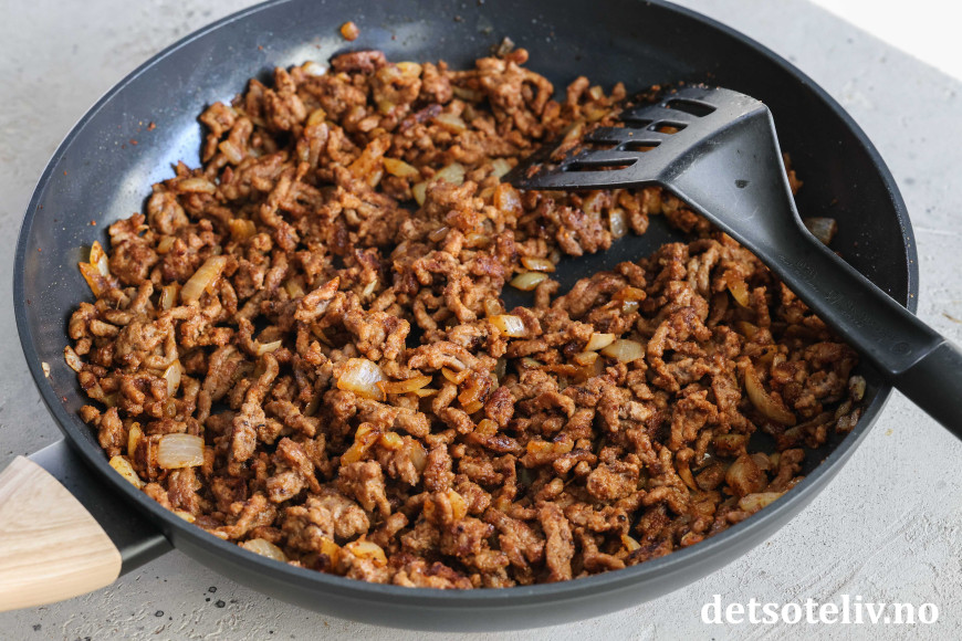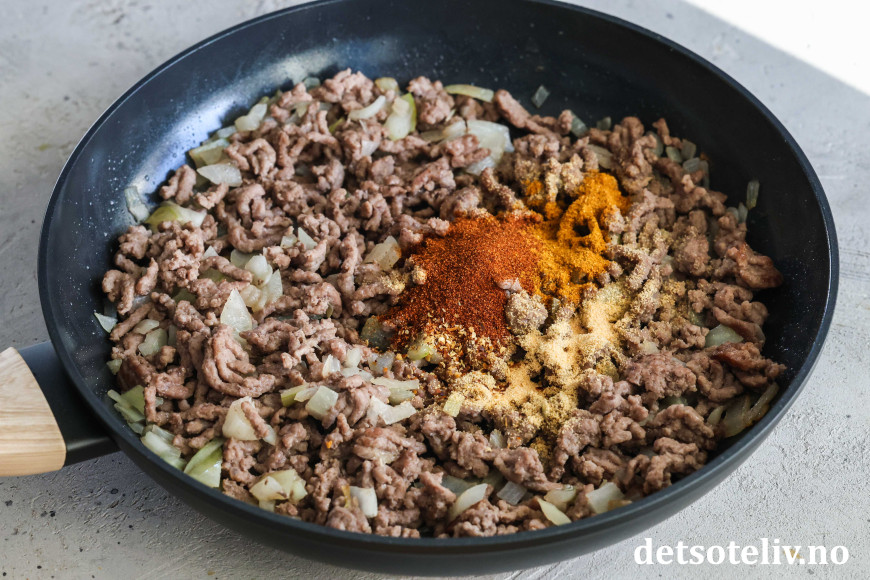Mens pastaen koker, steker du kjøttdeig og hakket løk i en panne. Tilsett krydderet og stek videre. Kjøttdeigen skal bli nokså godt stekt.