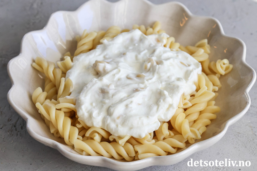 Ha kokt pasta i en pastaskål. Ha over rikelig med yoghurtsaus. Legg på stekt kjøttdeig. Drypp over litt paprikasmør.