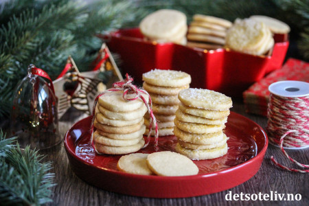 ♥ Småkakene er kjempegode hele året og trengs slett ikke begrenses til julen! Kakene kan også pyntes med mandelflak, se oppskrift på Mørdeigsskiver.