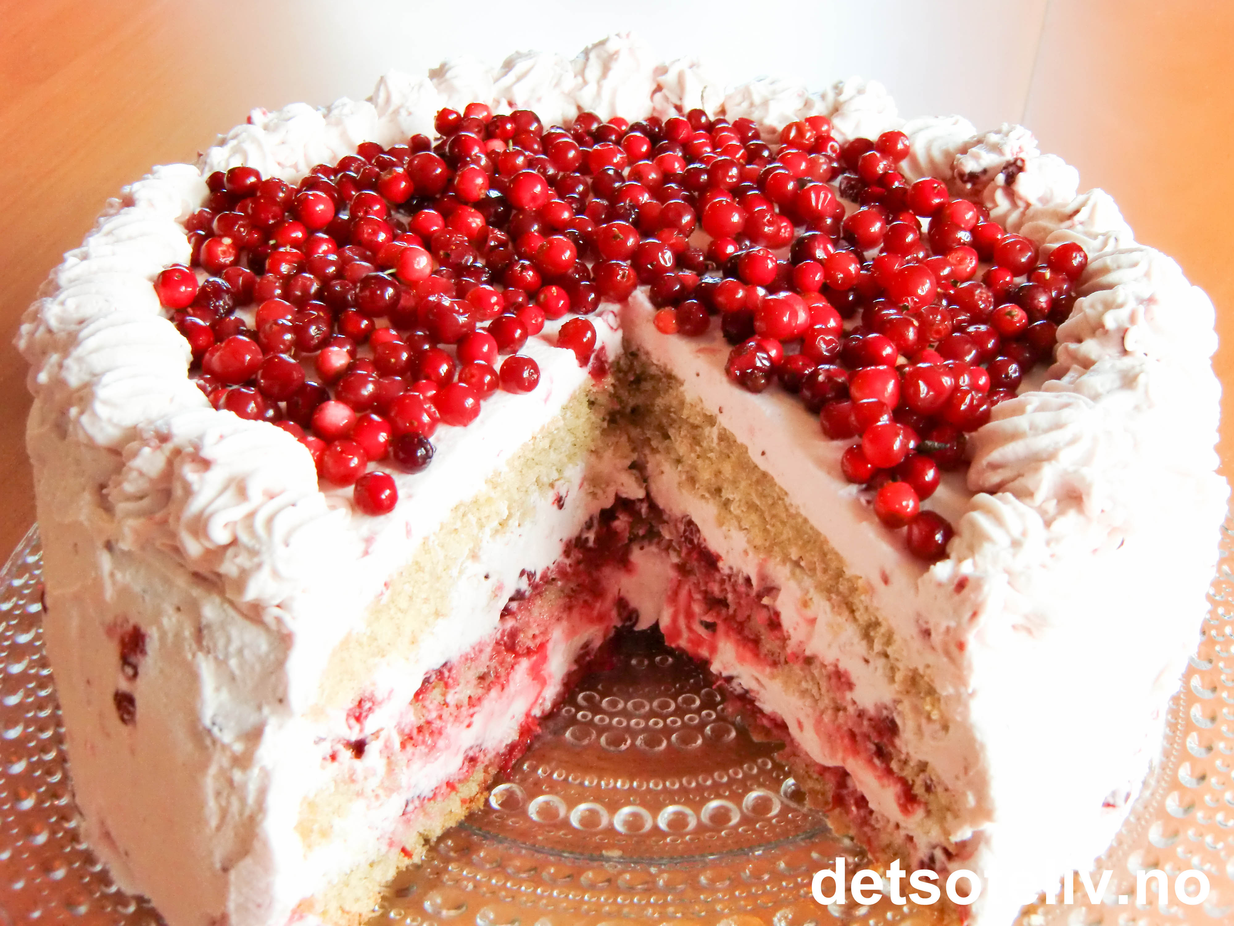 Fantastisk, kremete drøm av en tyttebærkake, som gir deg følelsen av å spise et ekte, vakkert stykke Norge!