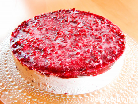 Ta iskaken ut av formen og fordel over tyttebærene med den smeltede gelatinen. Sett kaken tilbake i fryseren i noen timer (eller over natten).