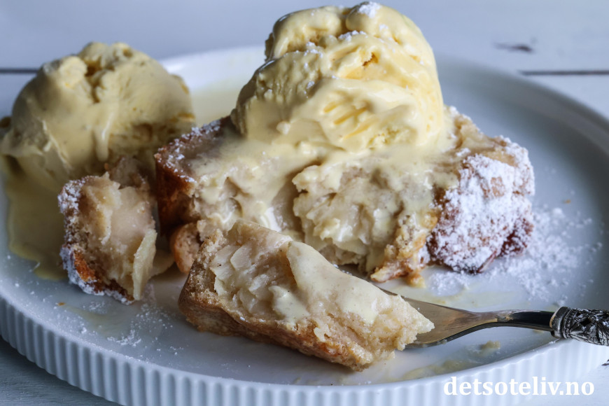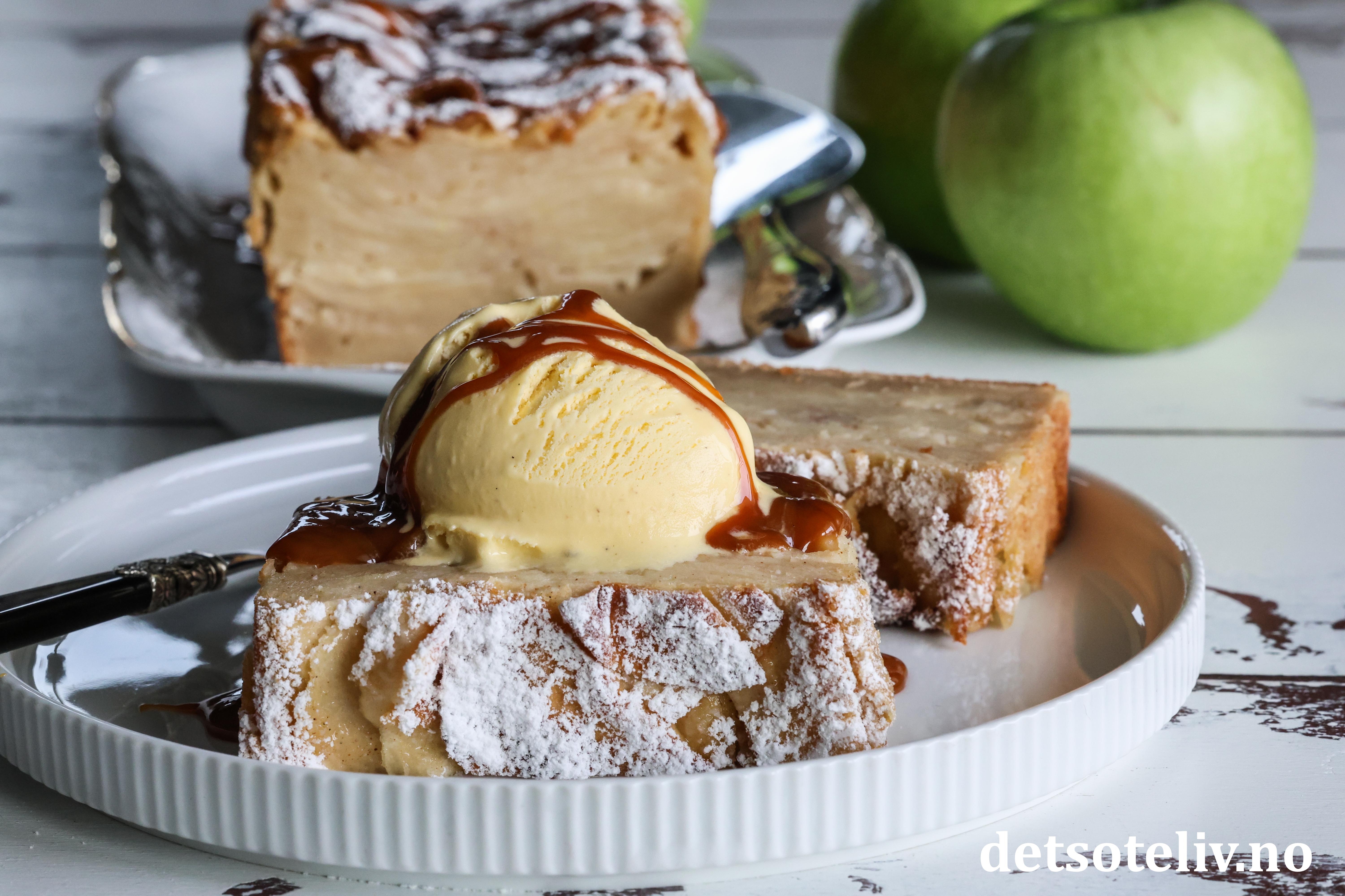 Eplekaken er nydelig sammen med vaniljeis og karamellsaus.