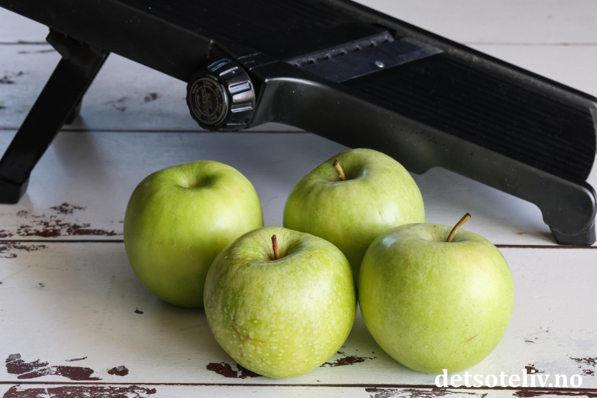 Finn frem eplene og en mandolin (se tips). Skrell eplene og skjær dem i båter. Bruk deretter mandolinen til å høvle eplebåtene i helt tynne skiver (ca. 2 mm tykkelse).