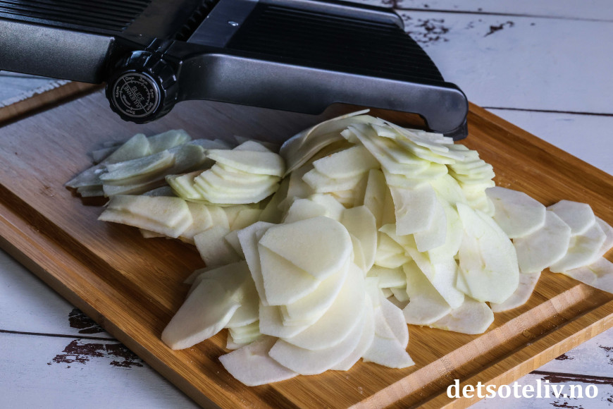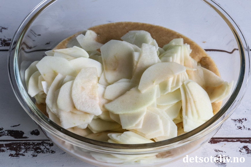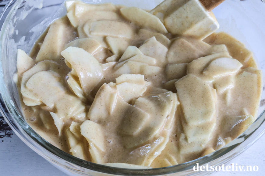♥ Husk at epleskivene blir brune hvis de ligger for lenge. Du kan gjerne vispe kakerøren sammen først slik at du kan vende epleskivene inn i kakerøren straks de er ferdighøvlede. Du kan alternativt legge epleskivene i en bolle med kaldt vann og litt sitronsaft i for å hindre misfarging.