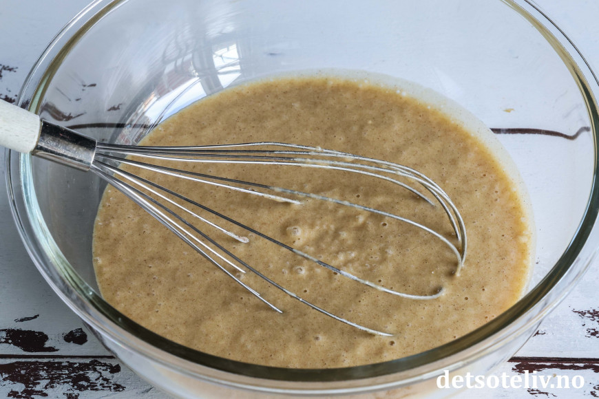 Visp raskt sammen ingrediensene til kakerøren. Den skal bli nokså tynn i konsistensen.