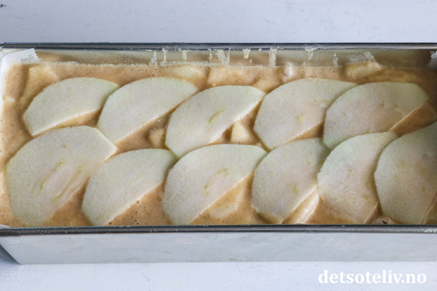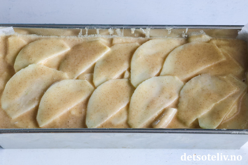 Kle en liten brødform som rommer 1 liter med bakepapir. Fyll formen med epledeigen. Pass på at det ikke oppstår luftlommer i kaken (se tips). Legg noen pene epleskiver på toppen og vend om slik at også disse får deig på seg.