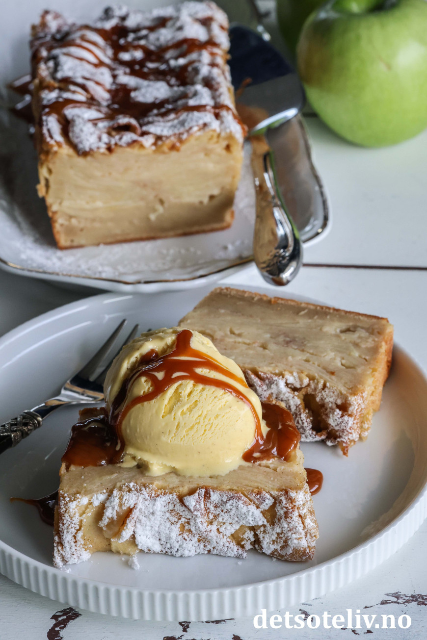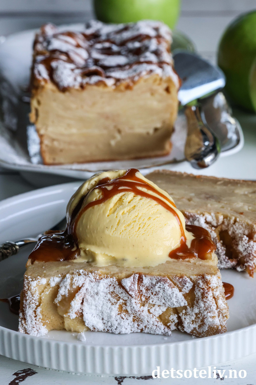 Server eplekaken i tykke skiver, gjerne sammen med vaniljeis og karamellsaus.