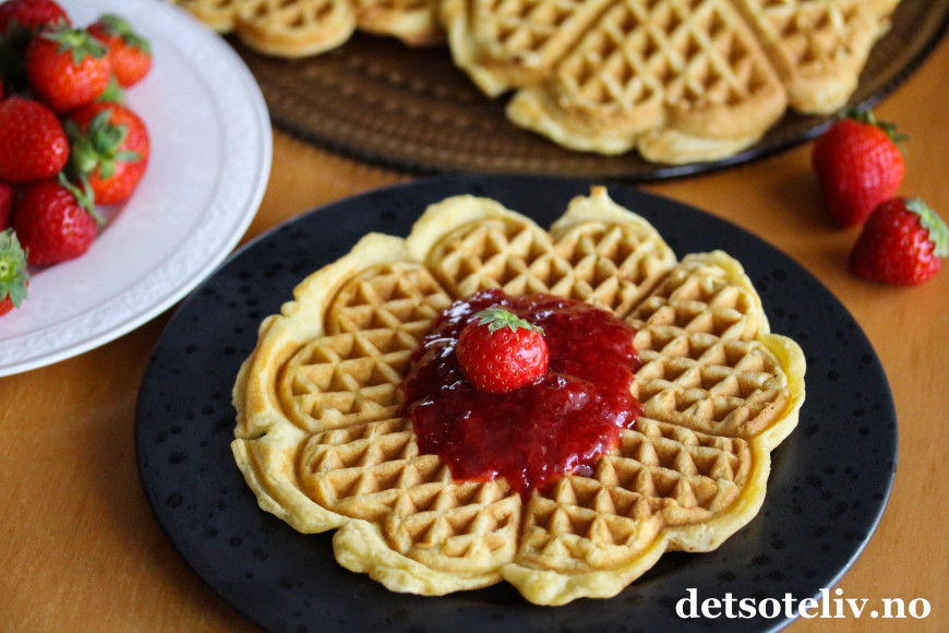 Vaflene smaker best nystekte! Serveres med syltetøy, rømme eller krem.
