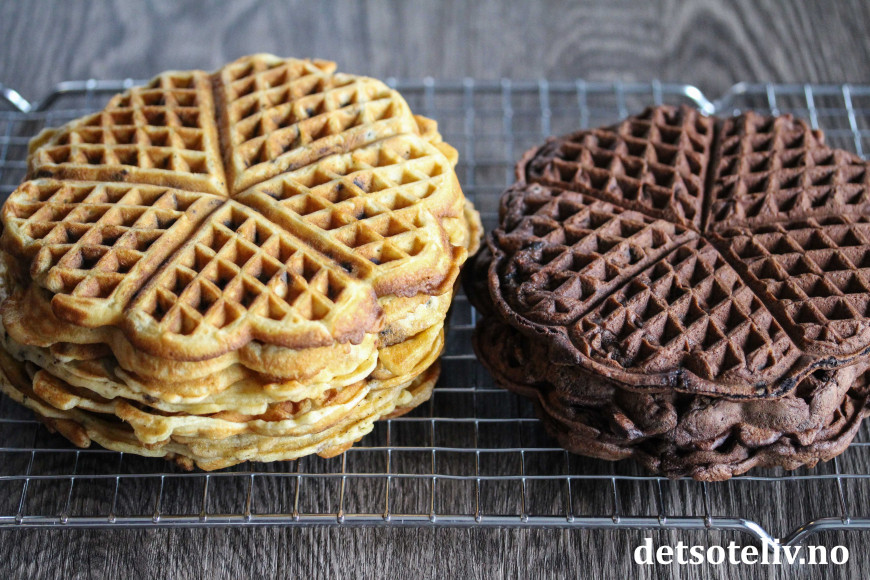 Det blir en utrolig stilig effekt på vaffelkaken når noen av vaffelplatene lages med kakao.