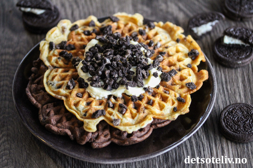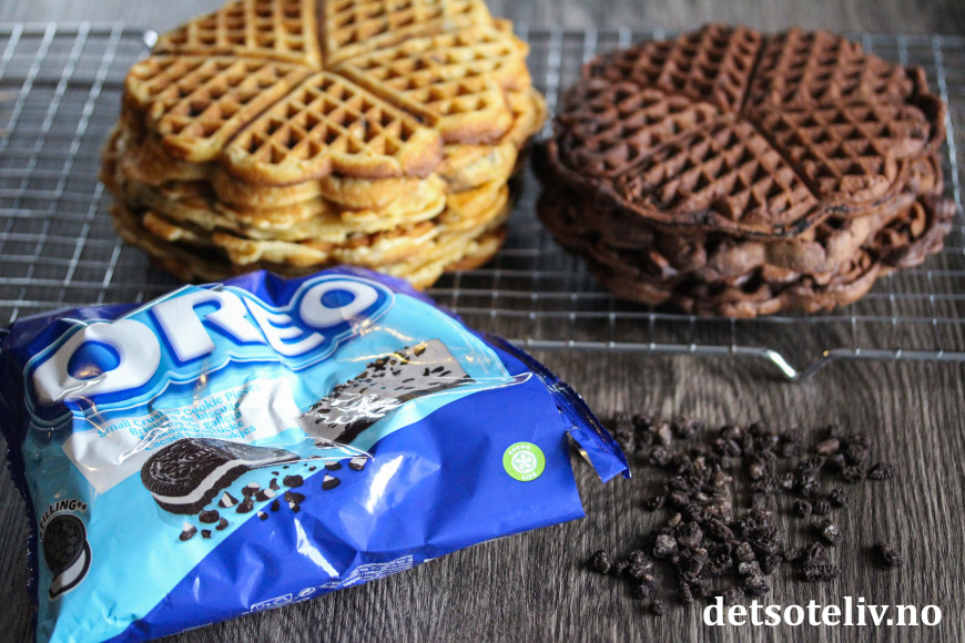 ♥ Du kan hakke vanlige Oreos til denne oppskriften. Jeg kom over en pakke med ferdighakkede Oreos, som jeg brukte denne gangen. Det fine da er at alle Oreobitene blir omtrent like store og derfor fordeler seg fint i vaflene. Men smaksmessig blir det helt det samme med hakkede vanlige Oreokjeks.
